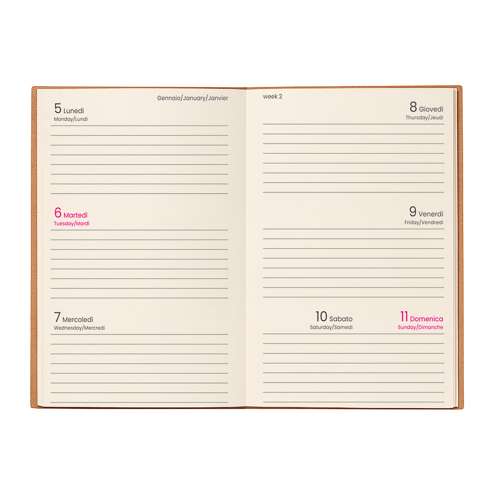 Agenda tascabile settimanale 2026 con copertina flessibile in cartoncino. 12 mesi. 64 pagine in carta avorio da 70 g/m2. Copertina personalizzabile.
