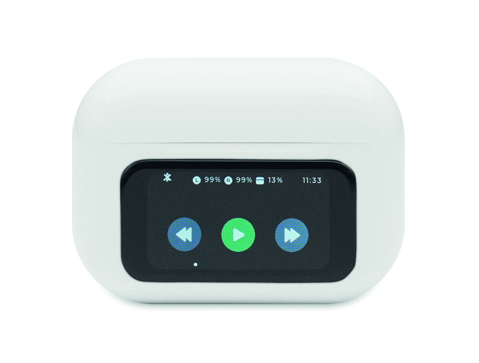Auricolari stereo True Wireless Stereo (TWS) 5.0 in ABS (30 mAh) con ANC/ENC, microfono e base di ricarica da 230 mAh. Display touch screen.