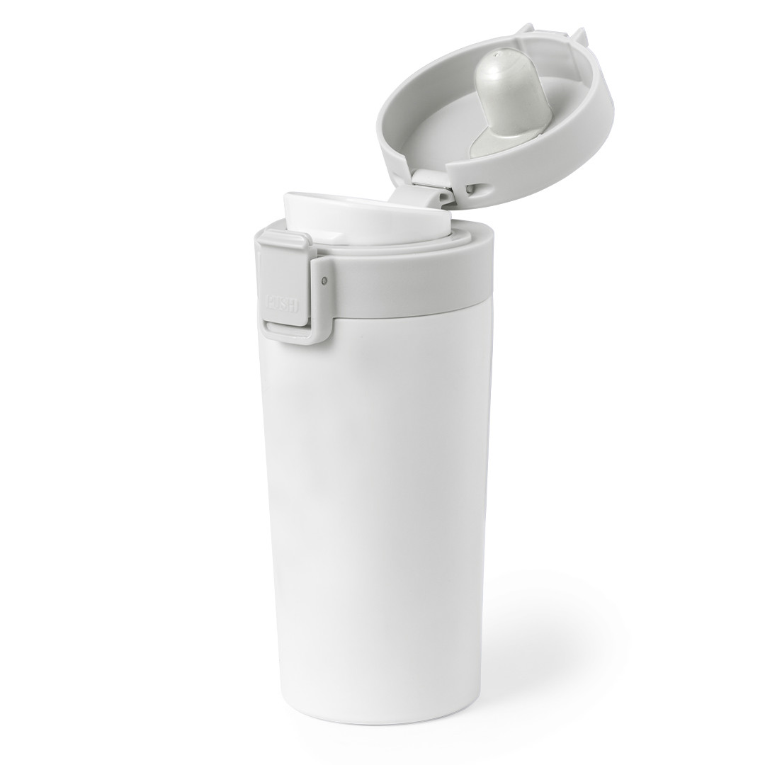 Bicchiere in ceramica a strato singolo, con coperchio e anello intermedio in silicone. Capacità 400ml. Il transfer su ceramica resiste al lavaggio in lavastoviglie. Disponendo di un solo strato potrebbe scaldarsi anche esternamente.