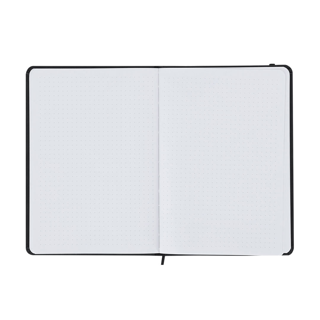 Blocco note fatto di elegante PU. Con copertine rigide e 96 fogli di design tratteggiati. Include nastro per segnalibri e nastro elastico sul coperchio per una chiusura sicura. Copertina Rigida. 96 Fogli