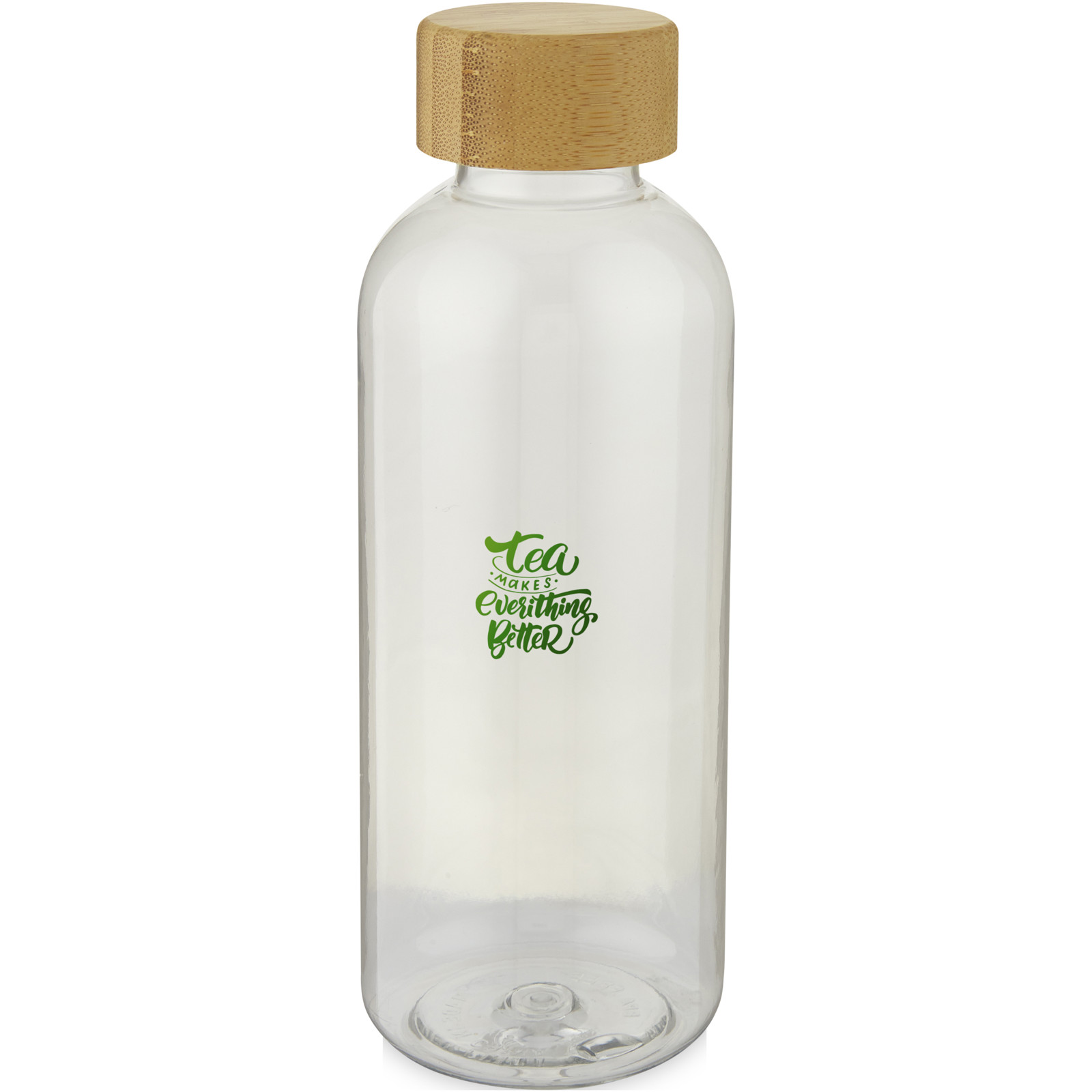 Borraccia riutilizzabile in plastica riciclata, con un elegante coperchio in bambù. La borraccia a parete singola è priva di BPA, è testata e approvata secondo la legislazione tedesca sulla sicurezza alimentare (LFGB). Testata e approvata per il contenuto di ftalati secondo il regolamento REACH. Il bambù proviene da fonti sostenibili, responsabili dal punto di vista ambientale e sociale. Capacità di 950ml. È consigliato lavarla a mano. Fornita in una confezione regalo in cartone riciclato.