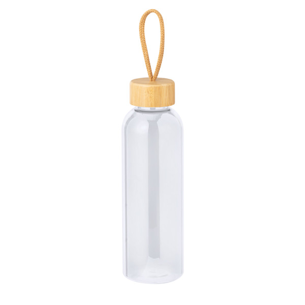 Borraccia in RPET da 650 ml, BPA Free. Tappo a vite in bambù, con cordino intrecciato. Disponibile in un'ampia gamma di colori. Presentata singolarmente in una sacchetto di carta. 650 ml