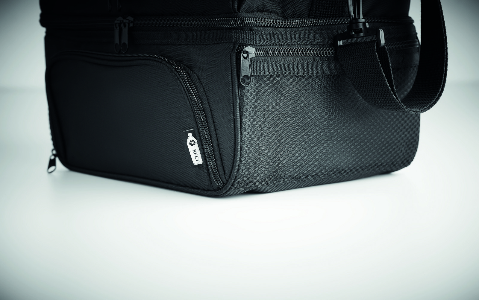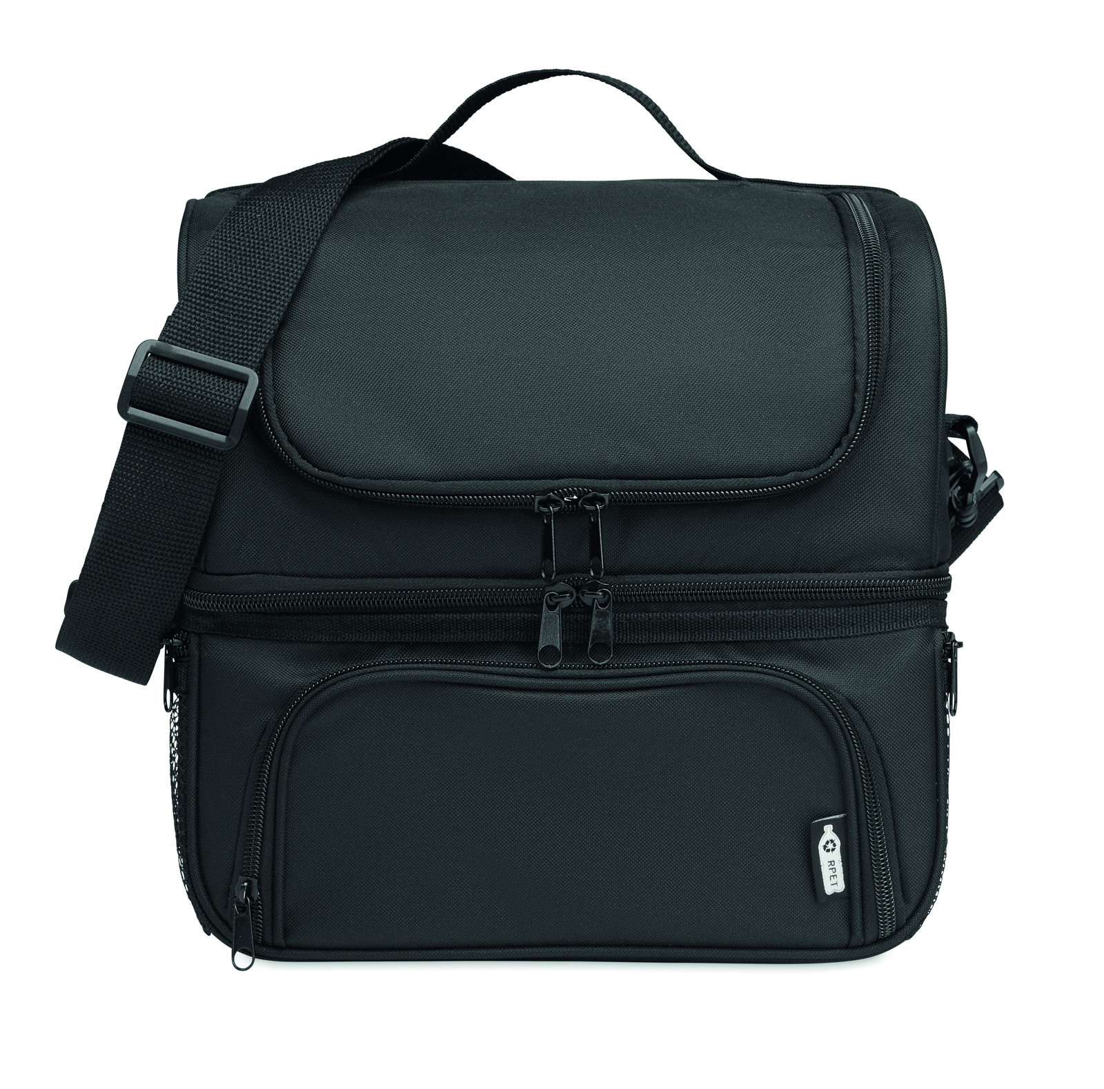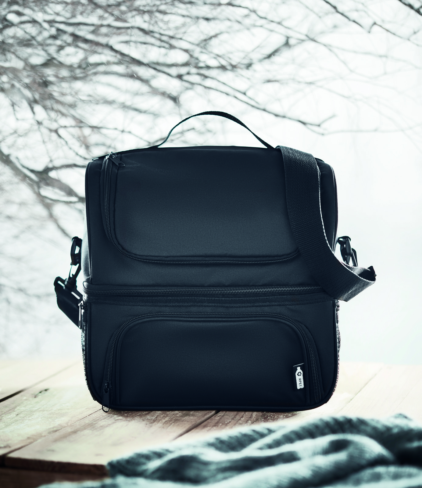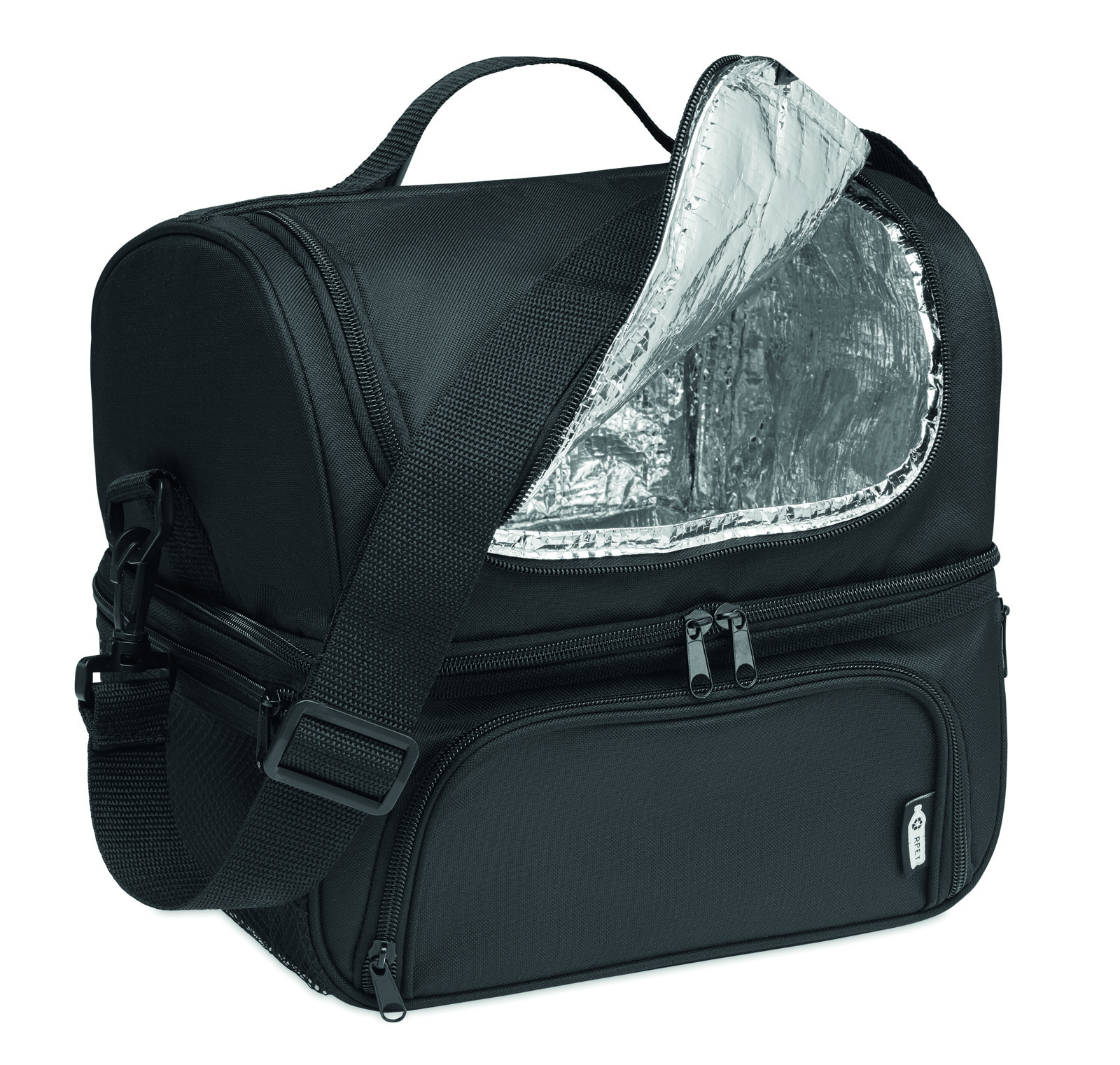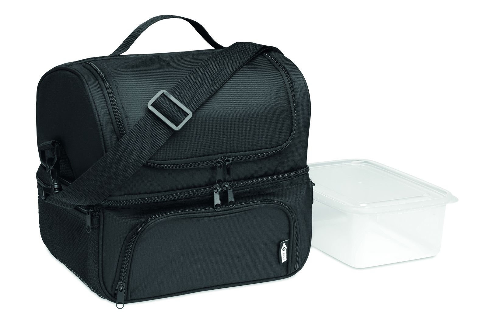 Borsa termica in 600D RPET, con portapranzo riutilizzabile in PP da 1900 ml. 2 scomparti per separare cibi caldi e freddi. Tracolla regolabile e removibile. Fodera in foglio di alluminio da 2 mm.