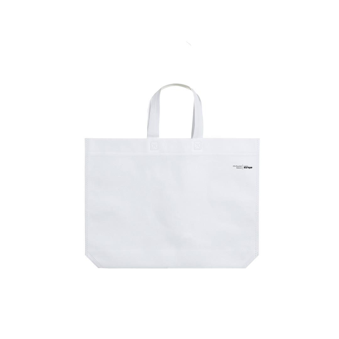 Borsa della linea Natura, realizzata in TNT riciclato da 70g/m2. Prodotta in Europa, con finitura termosaldata, soffietto, manici lunghi ed etichetta eco/made in sulla borsa.