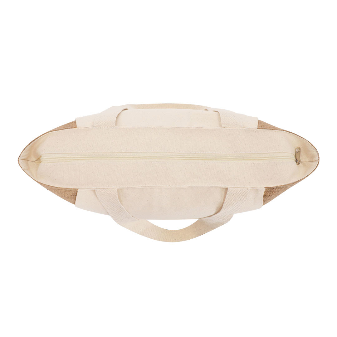 Borsa realizzata principalmente in cotone di 360 g/m2 e juta. Con manici lunghi rinforzati in cotone. Con fondo a soffietto e resistenza fino a 8kg di peso.