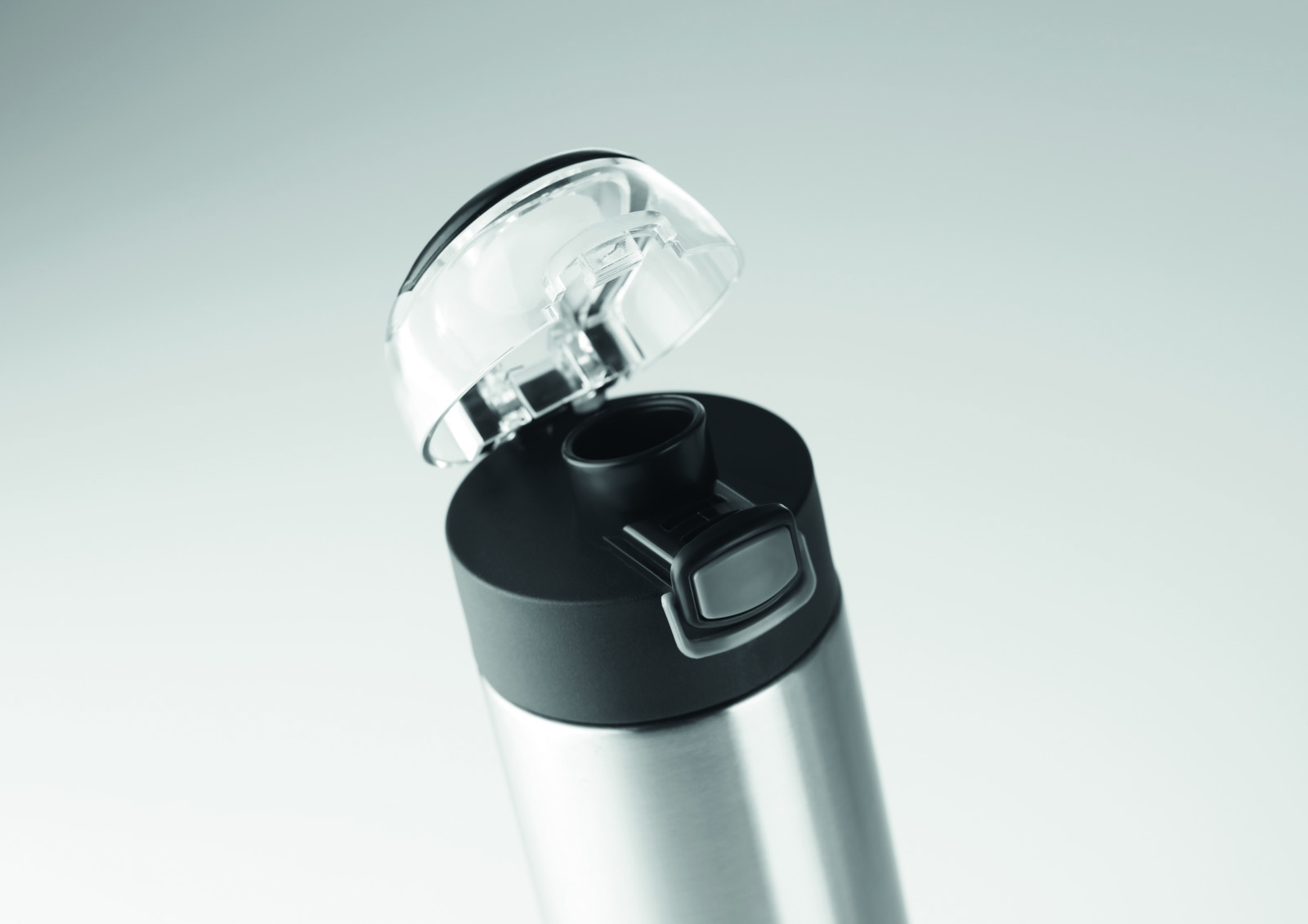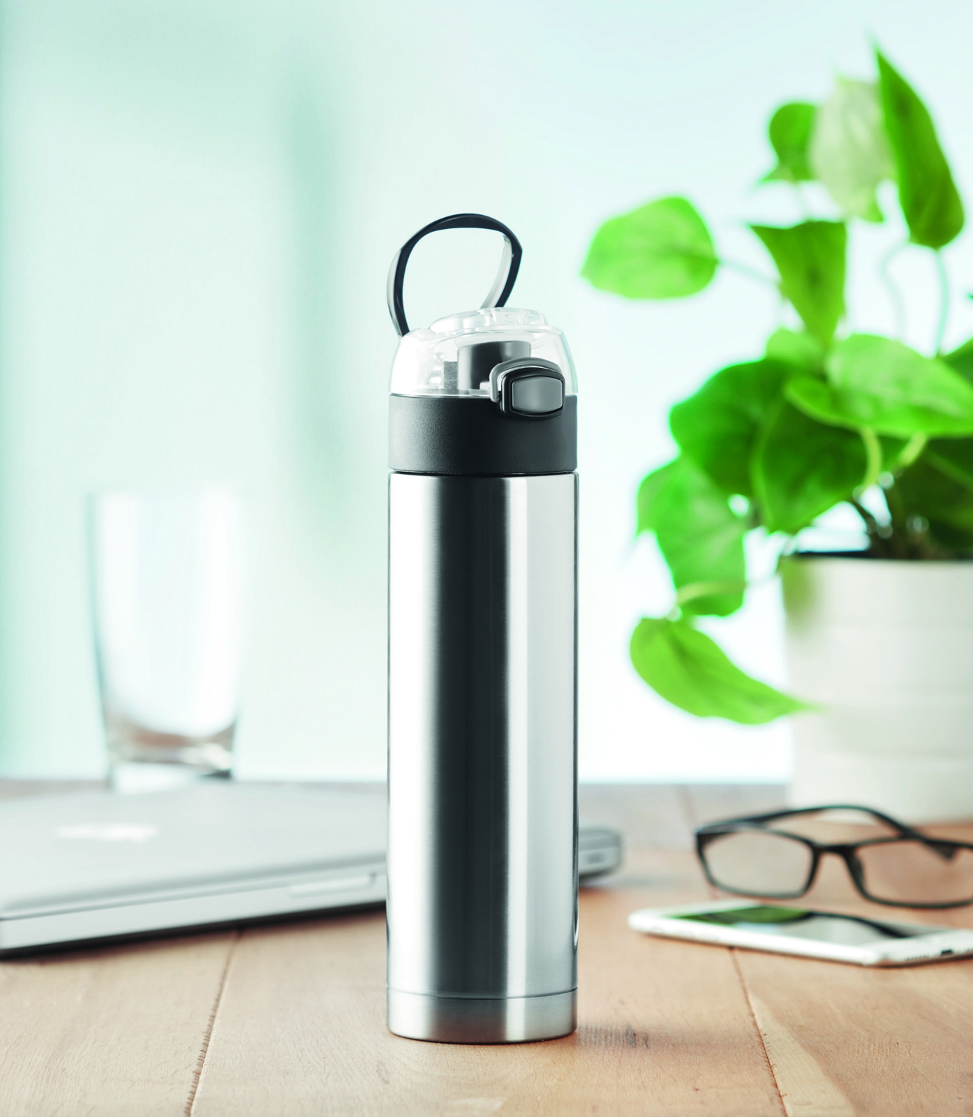 Borraccia doppia parete in acciaio inox con serratura di sicurezza sul coperchio e opzione di apertura a pressione. Presa pieghevole sulla parte superiore per un facilitarne il trasporto. 400 ml. Senza perdite.Antigoccia.