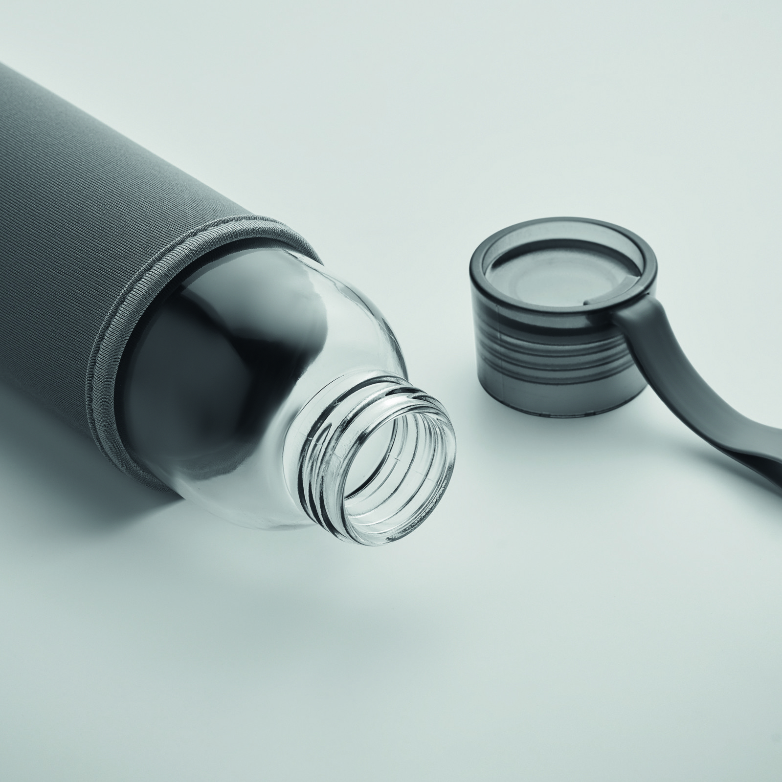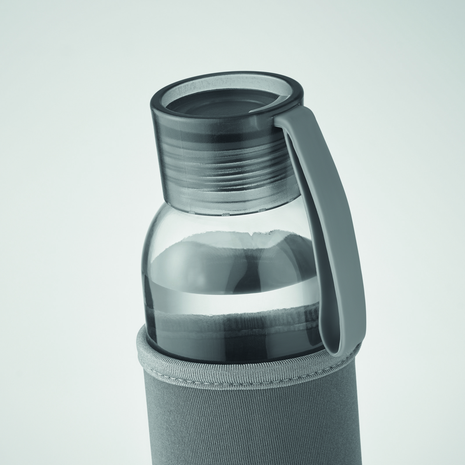 Bottiglia in vetro riciclato con custodia in neoprene e coperchio in PP con gancio in silicone. Antigoccia. Capacità: 500 ml.