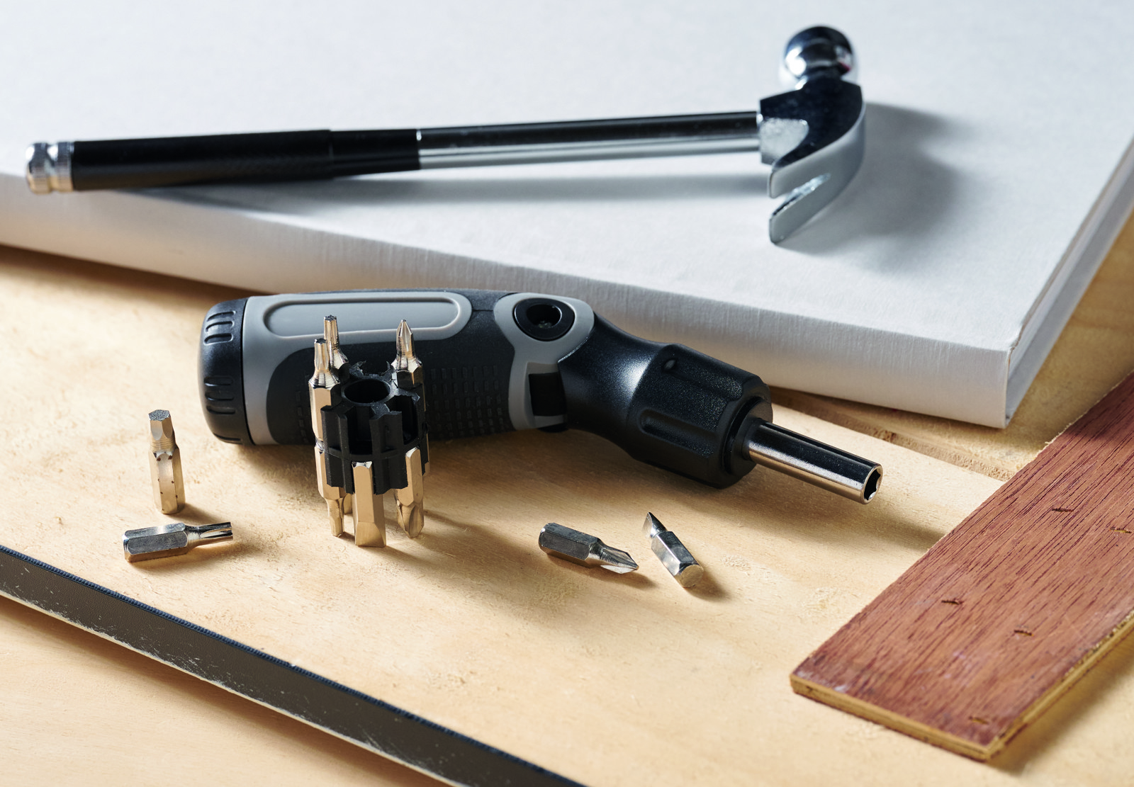 Set attrezzi in confezione di alluminio. Contiene: 1 tronchesina, 2 pinze, 6 cacciaviti di precisione, 1 cacciavite con meccanismo allungabile e 10 punte di ricambio.