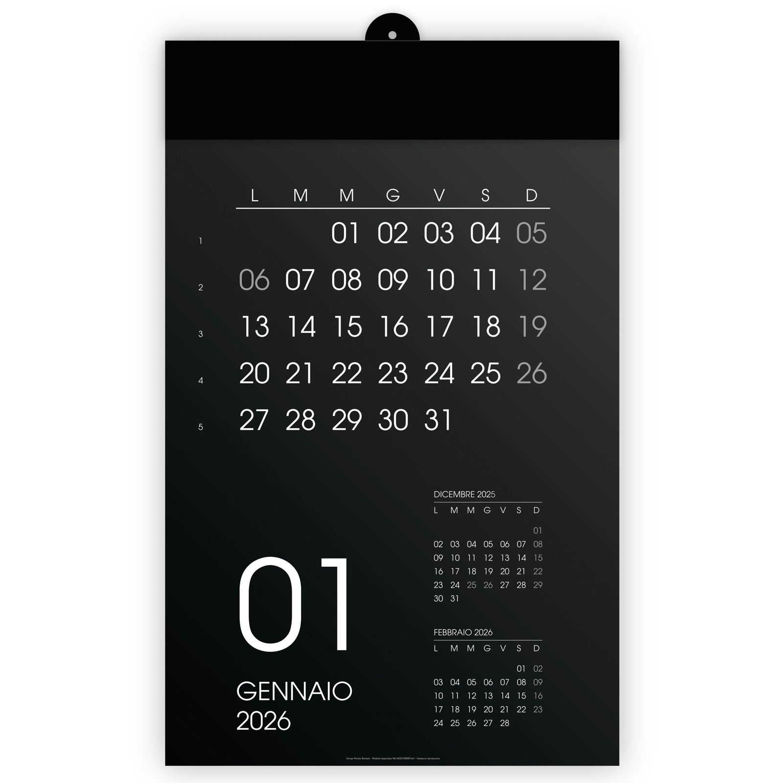 Calendario 2026 da parete mensile, 12 mesi, su cartoncino nero, termosaldato