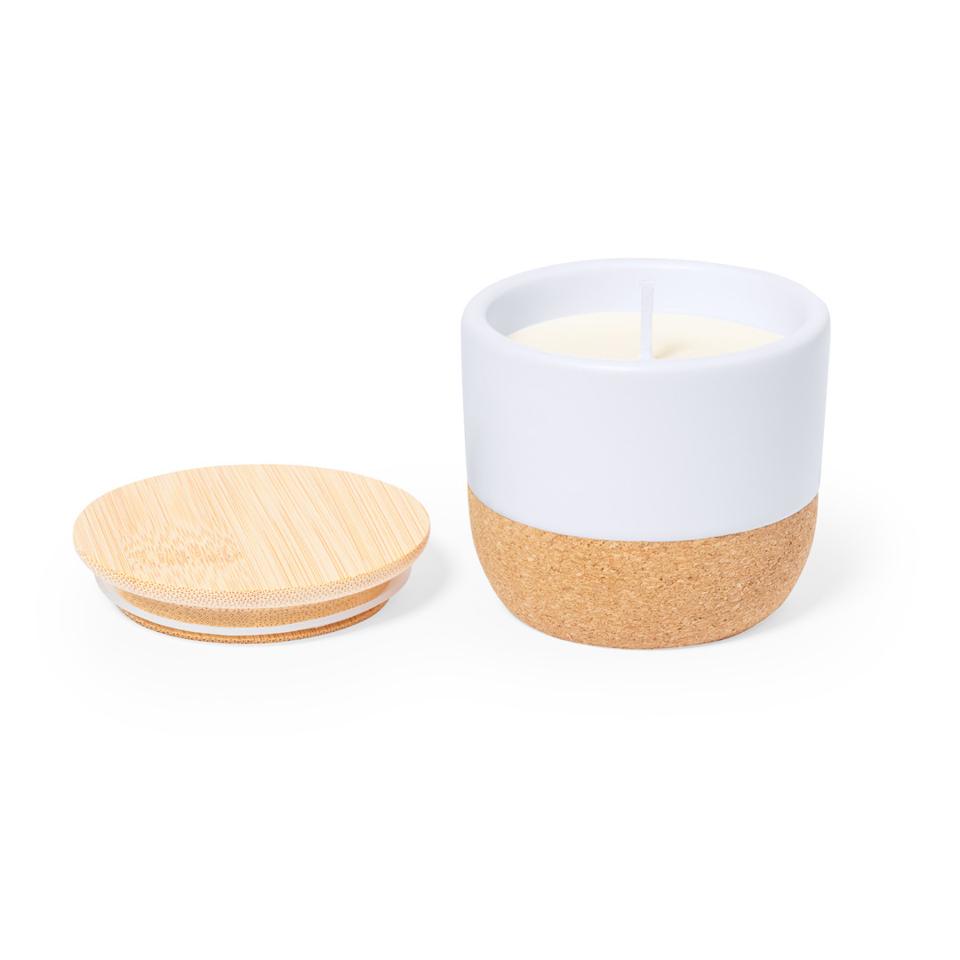 Candela aromatica al profumo di lino. Viene fornita in un originale vaso di ceramica bianca, con base in sughero naturale e coperchio in bambù. Presentata in una scatola individuale di design kraft. Cera Vegetale. Aroma Lino
