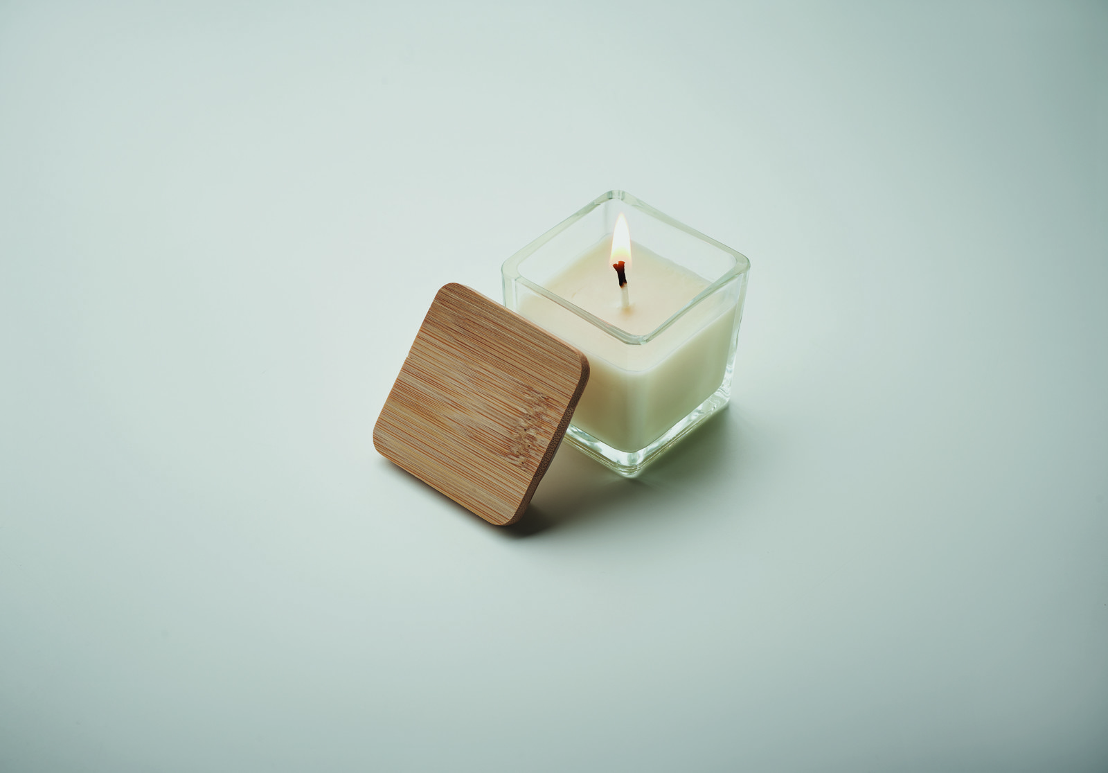Candela di cera profumata a base vegetale in supporto di vetro quadrato con coperchio di bamboo. 50 gr. Tempo di combustione: 8 ore. 06 – vaniglia – 08 – Limone - 10 - arancio - 48 mela.