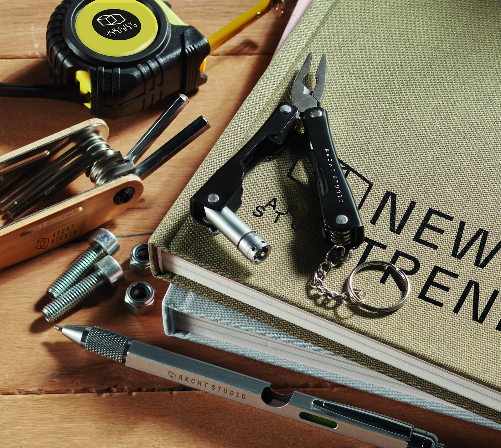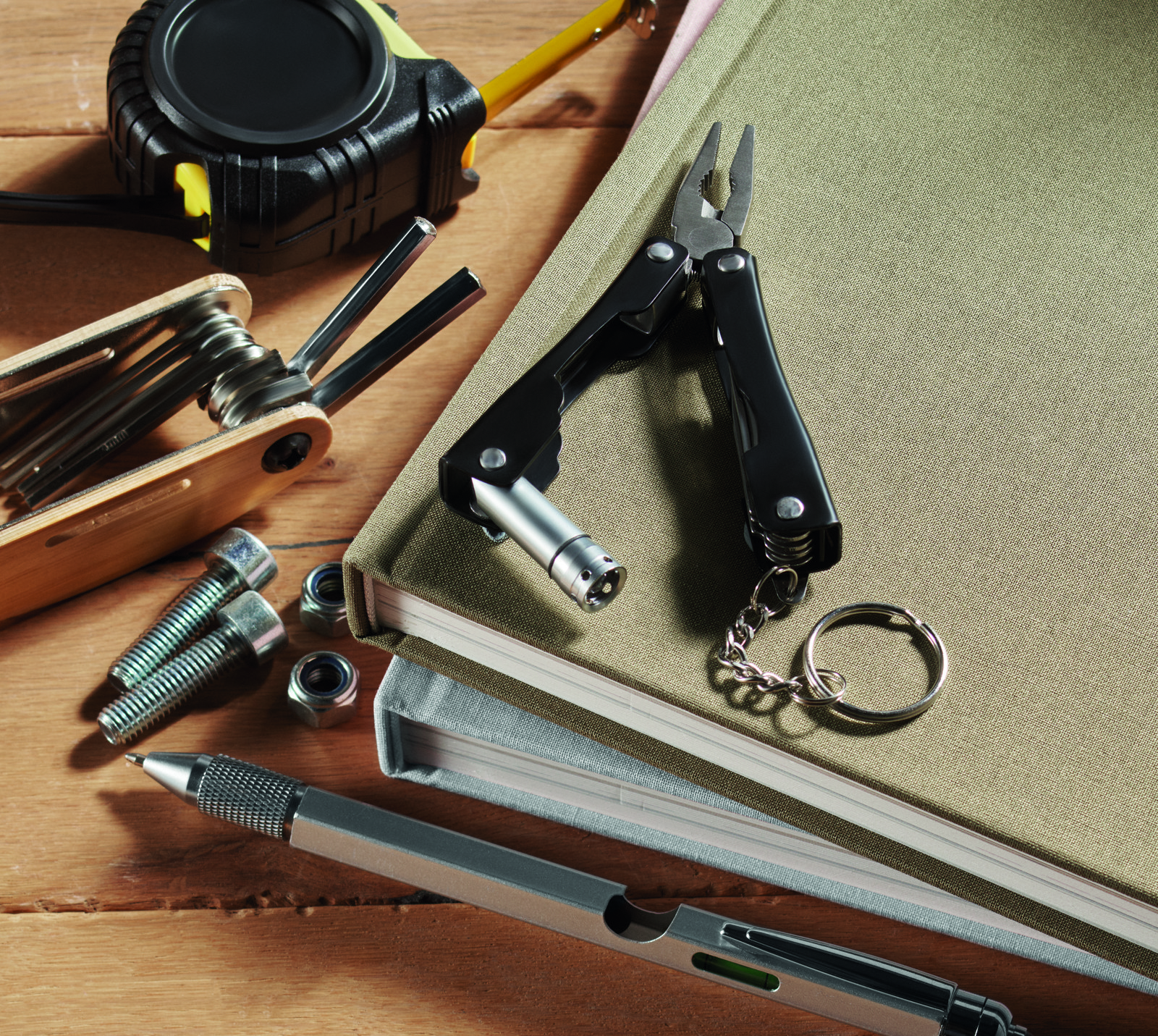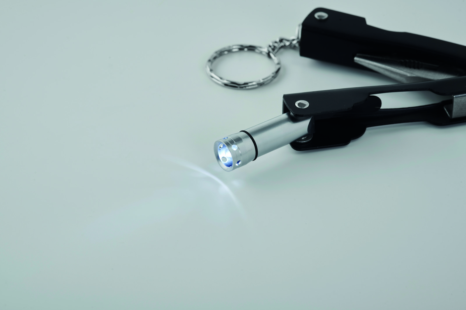 Coltello multiutensile pieghevole con torcia in acciaio inox. Include 10 funzioni di utensili e una custodia in poliestere 600D. Comprese 3 pile a bottone AG3.
