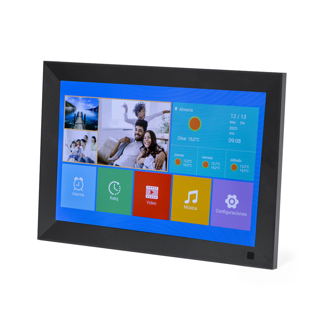 Cornice digitale da 10,1 pollici. Con schermo touchscreen IPS ad alta risoluzione da 1280x800 pixel, connettività WiFi e dotato di funzioni intelligenti come la visualizzazione del meteo, la sveglia e l'orologio. Inoltre, incorpora un menu per esplorare un mondo di possibilità quando si visualizzano video, foto e si ascolta musica, con la possibilità di scegliere la visualizzazione in orizzontale o in verticale. Con sostegno posteriore e slot per il montaggio a parete. Alimentazione 220V-240V AC, con caricabatterie incluso. Presentata in una scatola dal design kraft e manuale di istruzioni in inglese e spagnolo. 10,1". Wifi, 1280x800 IPS. AC 220-240V