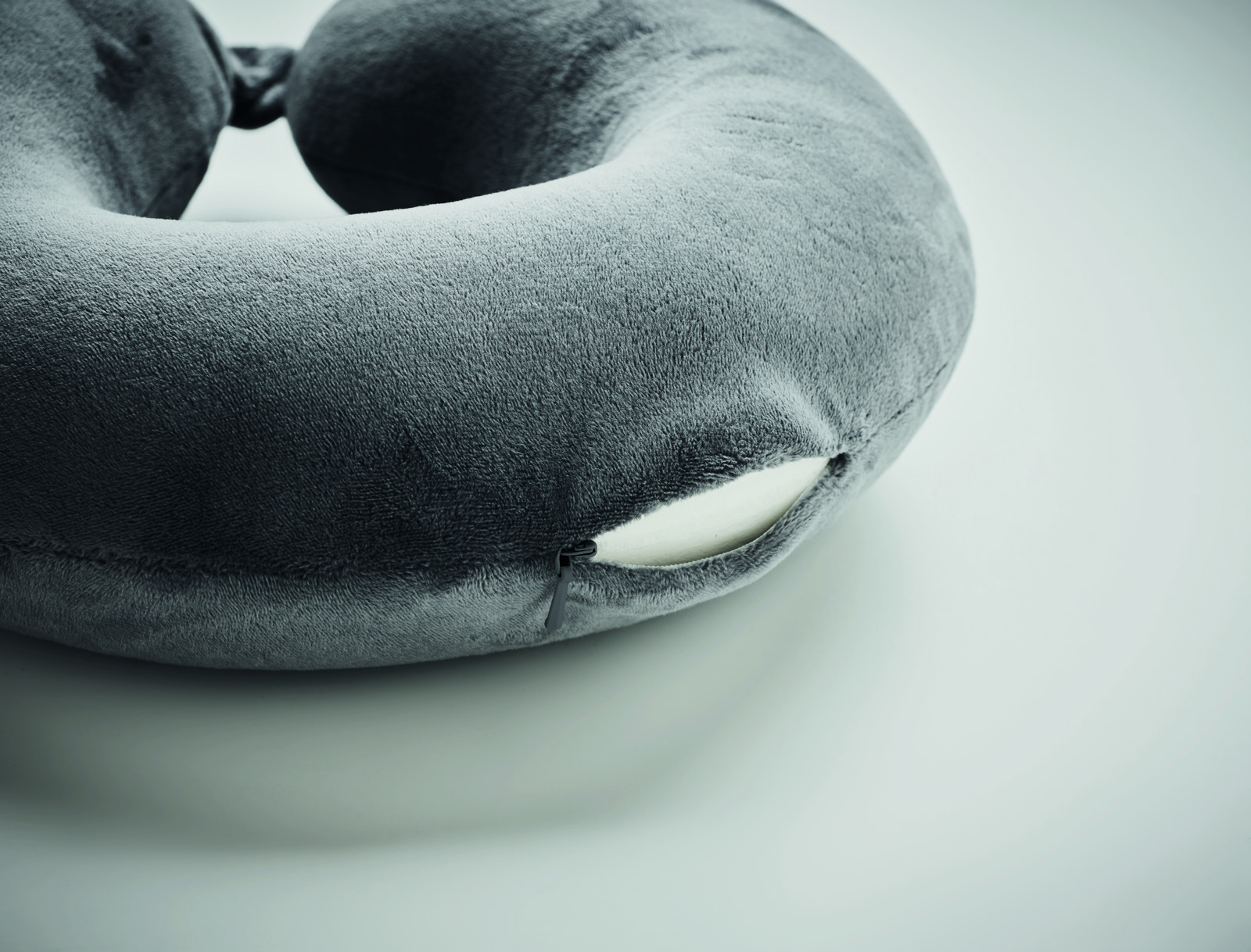 Cuscino da viaggio in tessuto cationico. Inclusa borsa con cordoncino in poliestere RPET. Ideale da portare in auto, in treno o in aereo.