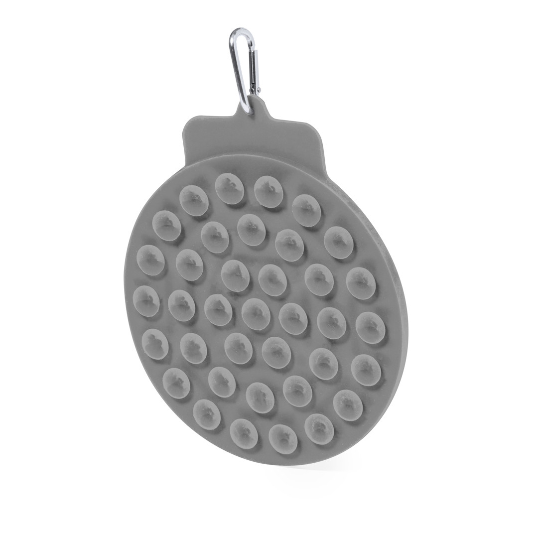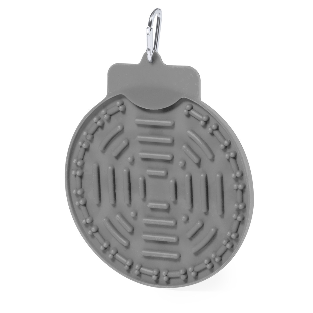 Tappetino per la pulitura della lingua per animali domestici in morbido silicone. Con potenti ventose per il fissaggio alle superfici piane, in modo che gli animali domestici possano leccare la superficie ruvida. Moschettone incorporato per un facile fissaggio. Presentato in un sacchetto individuale riciclato.