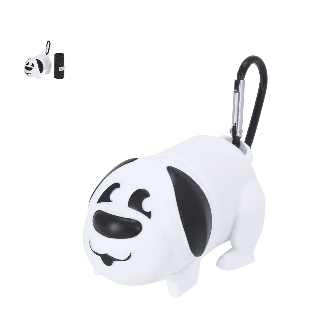 Dispenser di sacchetti per animali dall'originale design a forma di cane. Ha un moschettone per il trasporto. Include 15 borse. 15 Sacchetti Biodegradabili Inclusi