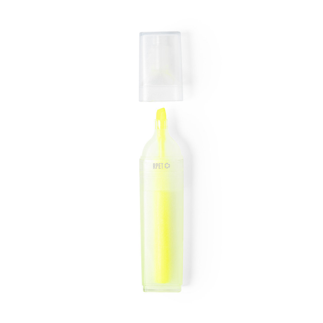 Evidenziatore della linea Natura in RPET, realizzato in plastica riciclata per promuovere il riutilizzo dei rifiuti plastici e aiutare la sostenibilità del pianeta. Con corpo trasparente e cappuccio abbinato. Con il logo RPET stampato sul marcatore.