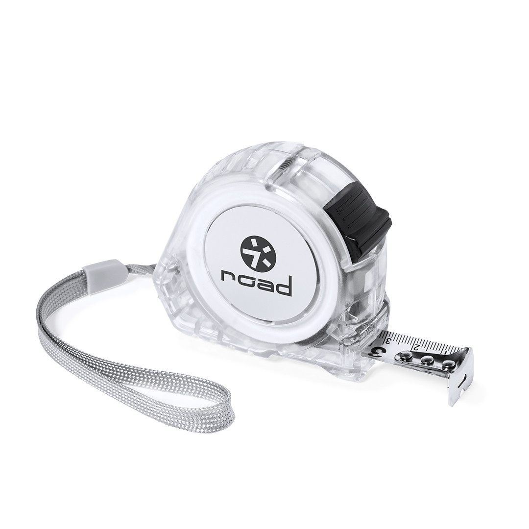 Flessometro da 5 metri con lama in metallo e meccanismo di bloccaggio. Con corpo in originale finitura trasparente, clip da cintura in metallo e cinghia di trasporto, con una zona speciale di stampa. Confezionato singolarmente in una scatola dal design kraft. Con Freno e Clip Incluso