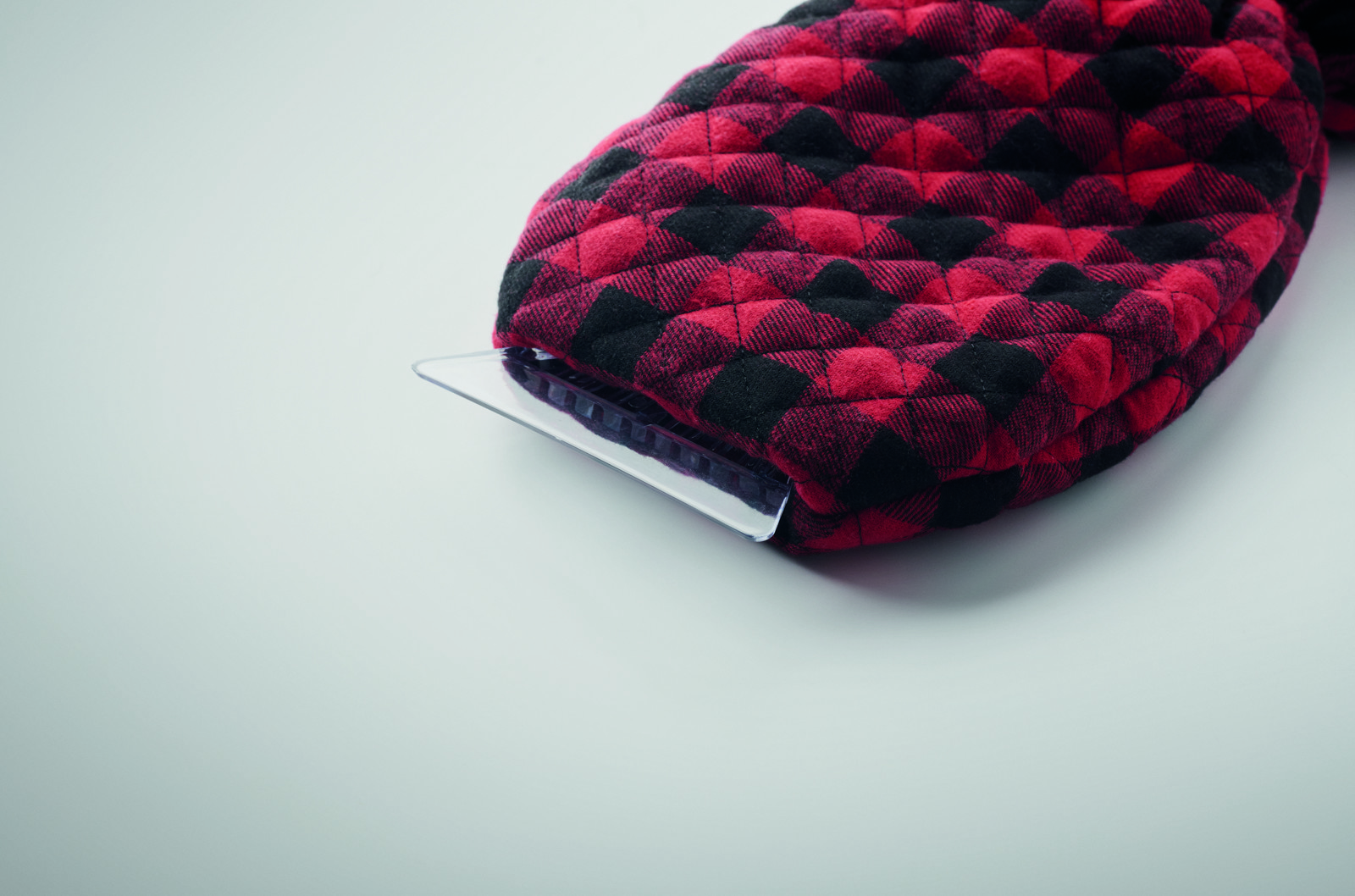 Guanto raschiaghiaccio in plastica con protezione imbottita in materiale sintetico.