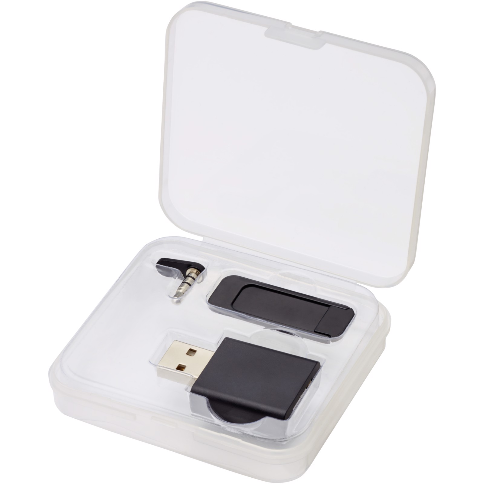 Kit per la privacy digitale che include un blocca dati USB, un blocco per webcam e un blocco per jack audio. La protezione dati USB impedisce lo scambio accidentale di dati quando si collega un dispositivo mobile a un computer o a una stazione di ricarica pubblica. Questo articolo bloccherà qualsiasi trasferimento di dati durante la ricarica del dispositivo, impedendo il furto di dati o l'installazione di malware. Il blocco per webcam può essere messo davanti alla webcam del portatile per bloccare qualsiasi accesso indesiderato alla webcam. Il blocco per jack audio può essere inserito nella porta AUX del dispositivo per evitare che terzi ascoltino le conversazioni. Fornito in una scatola protettiva.