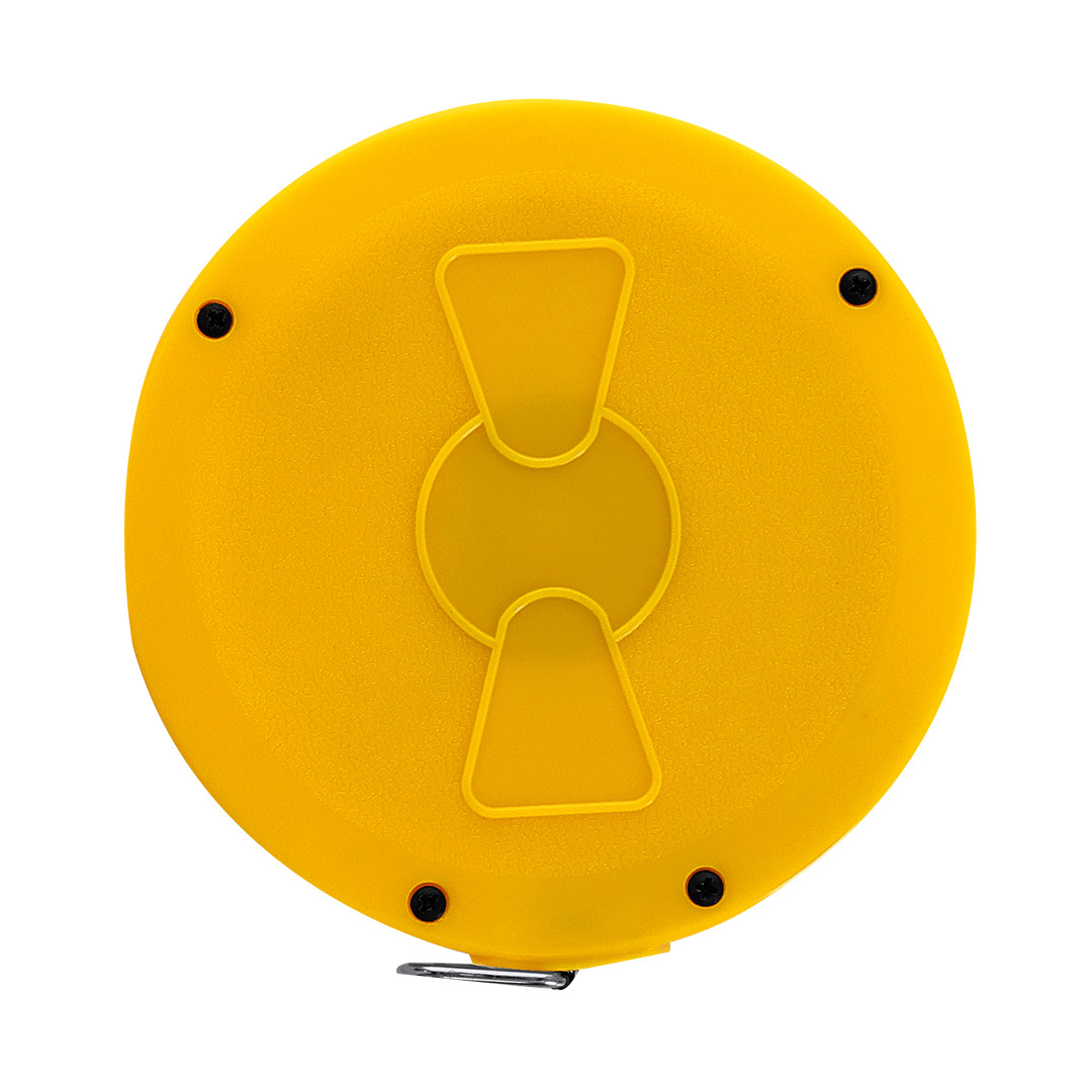 Metro a nastro lungo 15 metri in custodia PP e meccanismo a manovella. Scala stampata su nastro PVC nero per cm, e rosso per pollici.