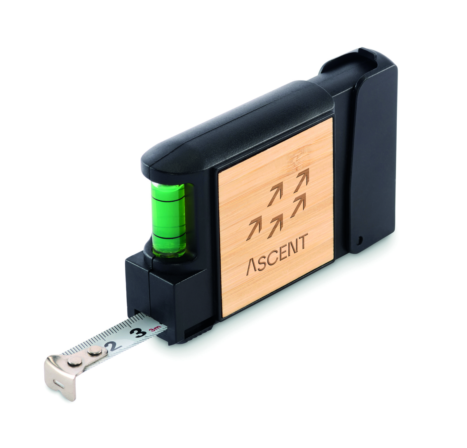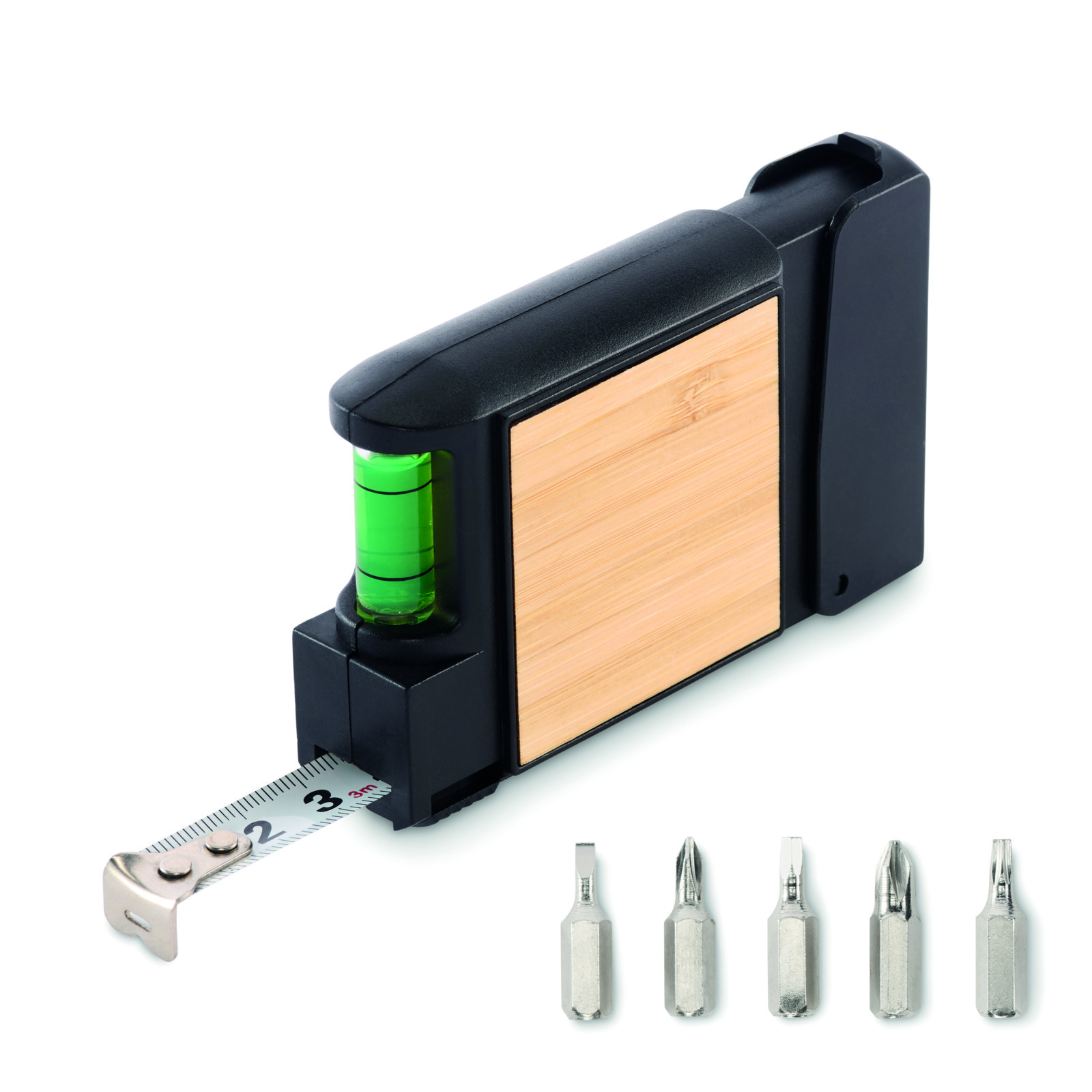 Metro retrattile multifunzionale 3M con dettagli in bambù, inclusa livella e set di cacciaviti con 5 punte.