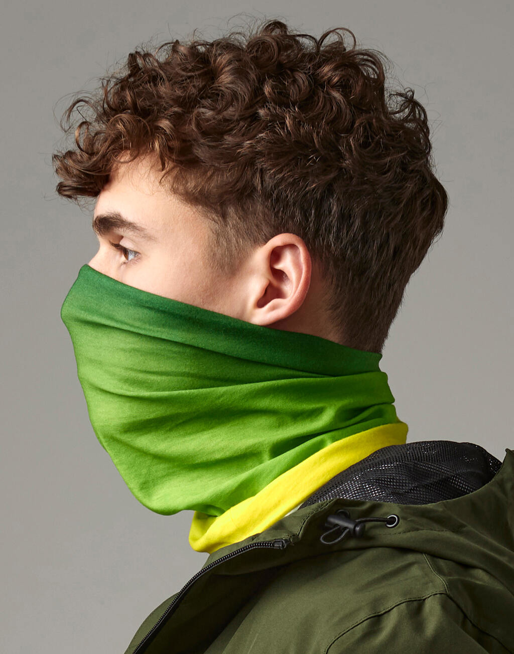 Sciarpa multifunzionale a forma di triangolo in policotone (90% poliestere 10% cotone).