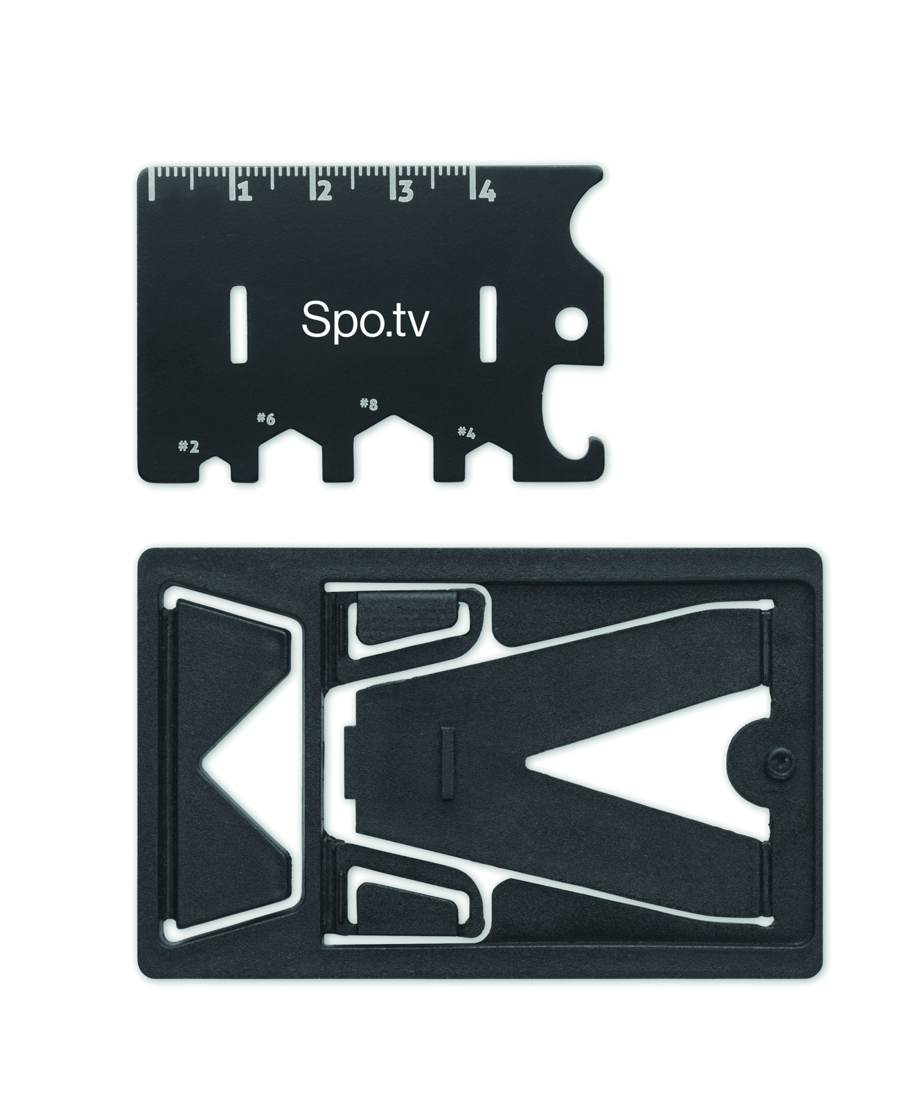 Multiutensile in acciaio inox e PP con funzionalità di supporto per il telefono con 6 funzioni in custodia in PU. Include cacciaviti, righello, chiave esagonale e apribottiglie.