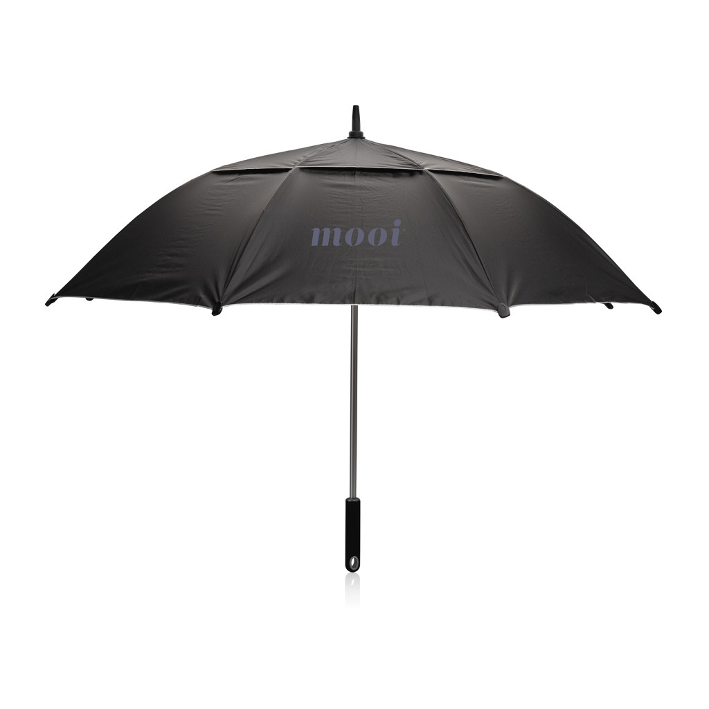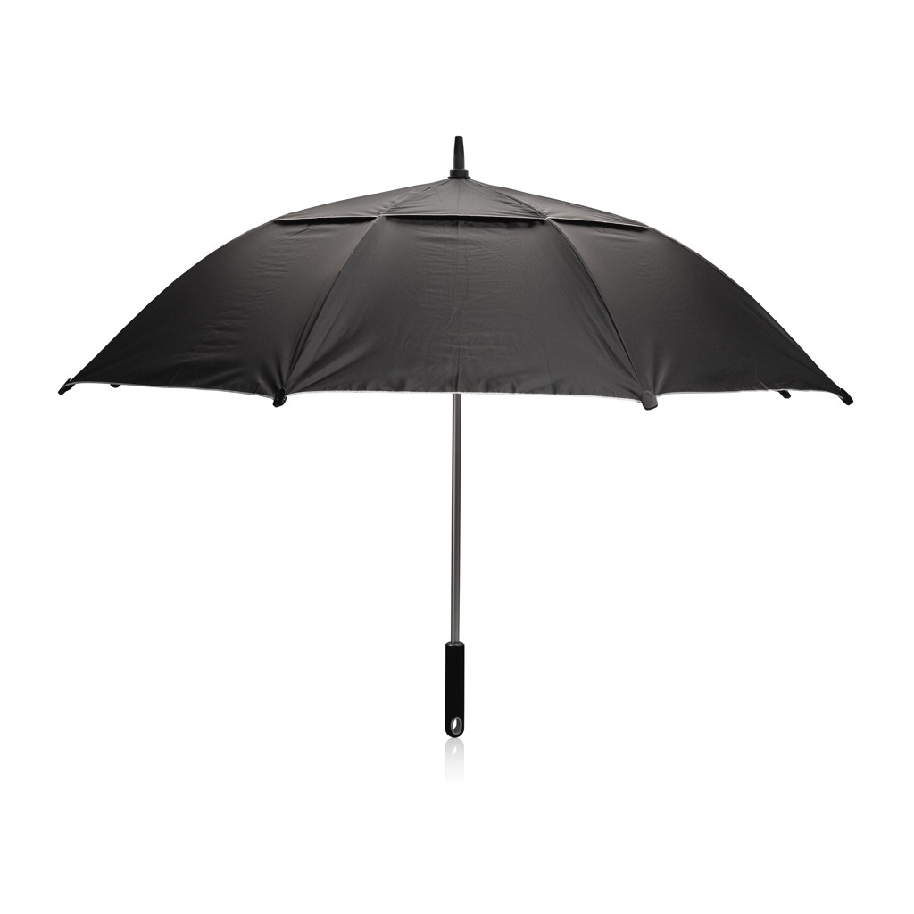 Ombrello 27'' in pongee 190T con manico in EVA. Struttura placcata in nero e punte in plastica nera. Apertura automatica.
