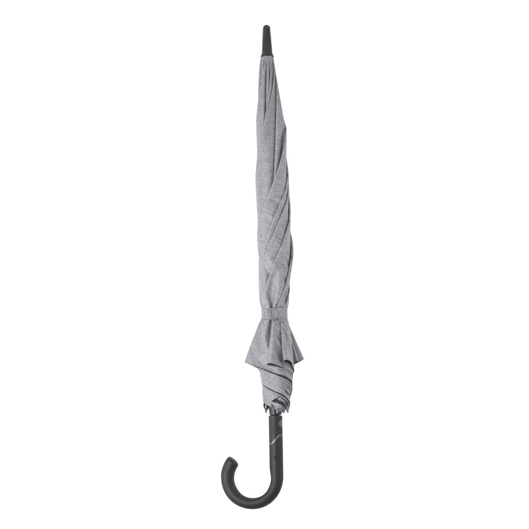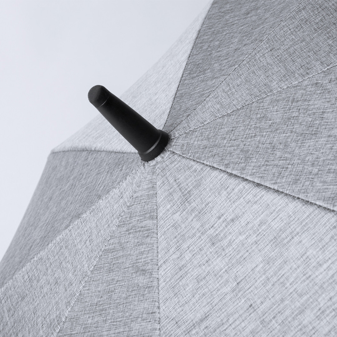 Ombrello di alta qualità con un diametro di 130 cm, realizzato in materiale poliestere 150D e in un'elegante tonalità grigio erica. Apertura automatica e aste in fibra di vetro, con sistema antivento e chiusura in velcro. Con manico ergonomico in morbido ABS e presentato in una borsa riciclata. 30". Automatico. Sistema Antivento