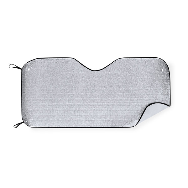 Parasole con lato anteriore in alluminio e lato posteriore in schiuma. Dimensioni 130 x 60 cm, con bordi in tessuto non tessuto e elastici neri per la piegatura. Include 2 anelli metallici e due ventose per il fissaggio al parabrezza. Presentato aperto in foglio per una facile stampa.