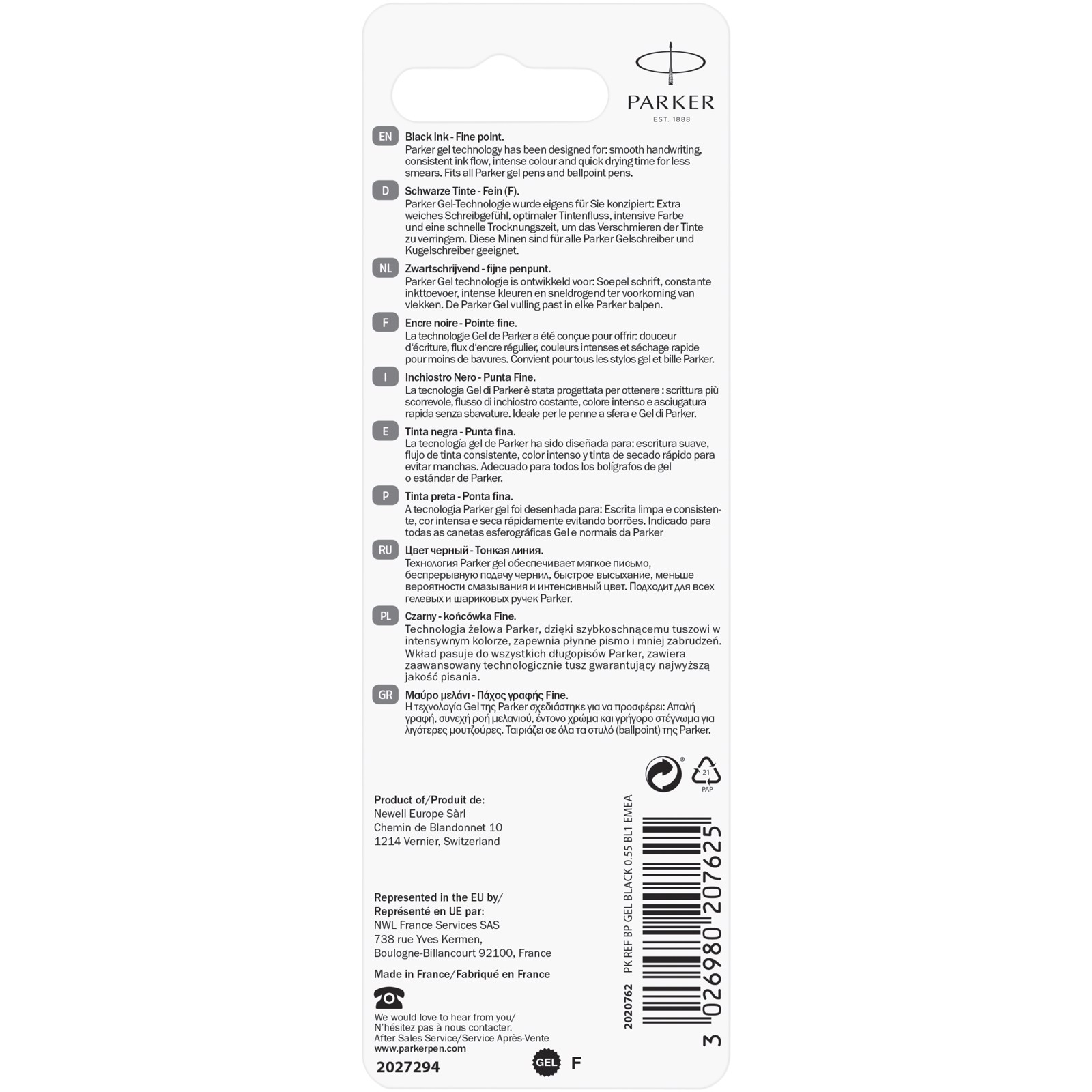 Ricarica per penna a sfera in gel progettata per adattarsi a tutte le penne a sfera Parker e per offre una sensazione di scrittura alternativa con una finitura liscia come la seta. Il refill permette di scrivere per 2500 metri ed ha una dimensione del pennino di 0,7 mm (medio). Confezionato in blister.