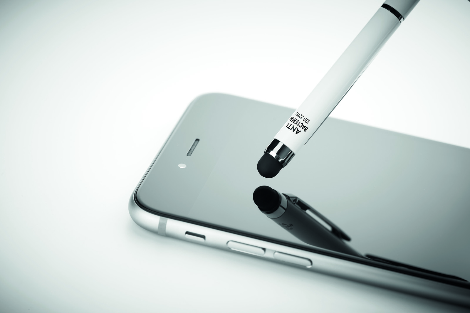 Penna a sfera e touch, meccanismo twist, in alluminio con fusto antibatterico e clip cromata lucida. ISO 22196. Inchiostro blu.