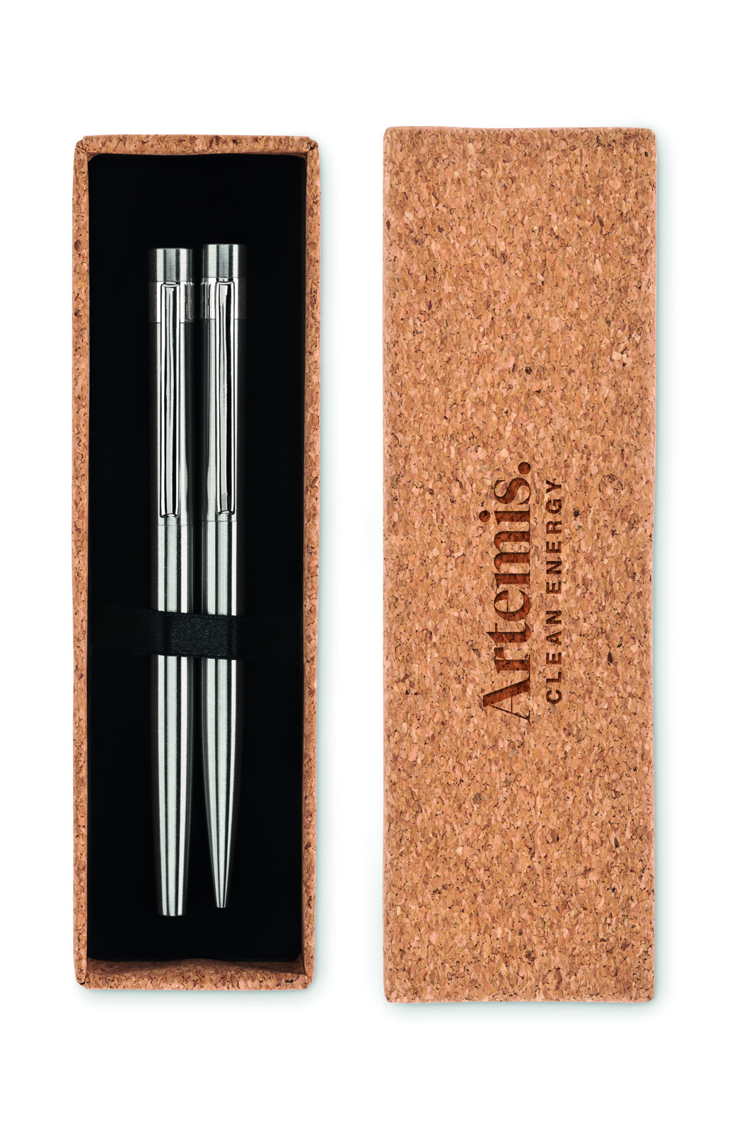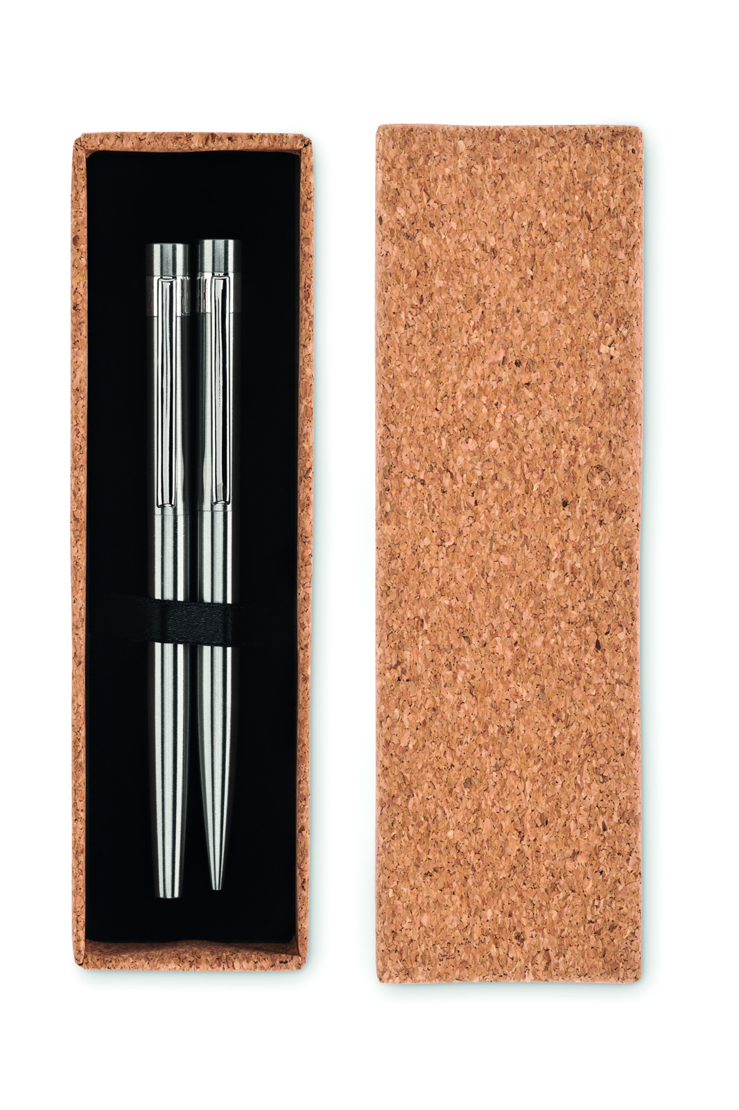 Set di penne in acciaio inossidabile riciclato con penna a sfera e roller. Presentato in una scatola di sughero abbinata. Inchiostro blu e nero rispettivamente.