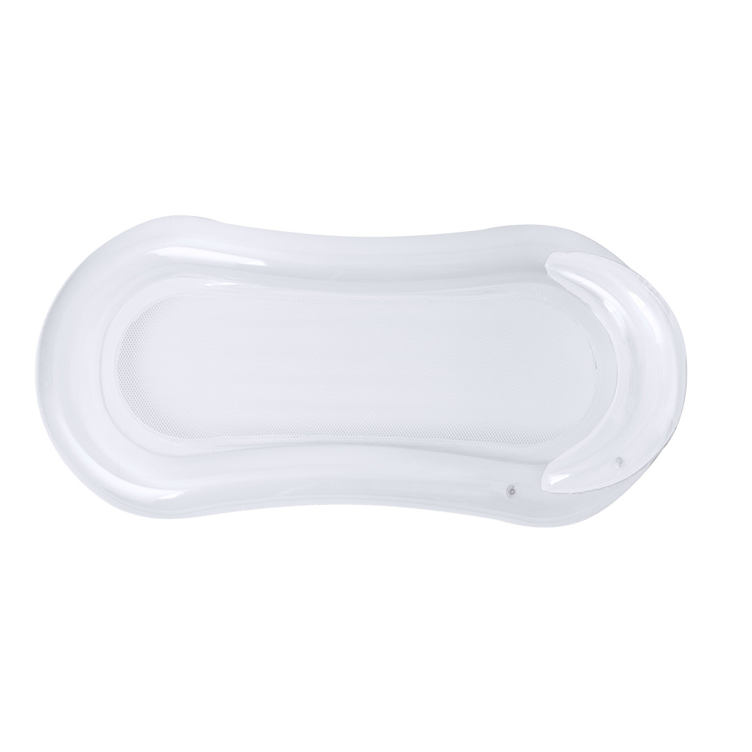 Materassino originale in resistente PVC. Include un comodo cuscino per la testa, dal design bicolore, nei colori trasparente e bianco. Include una resistente rete centrale in poliestere bianco. Con piegatura speciale per una facile stampa. Viene fornito sgonfio e in una pratica busta individuale riciclata. Appositamente Piegata per la Stampa