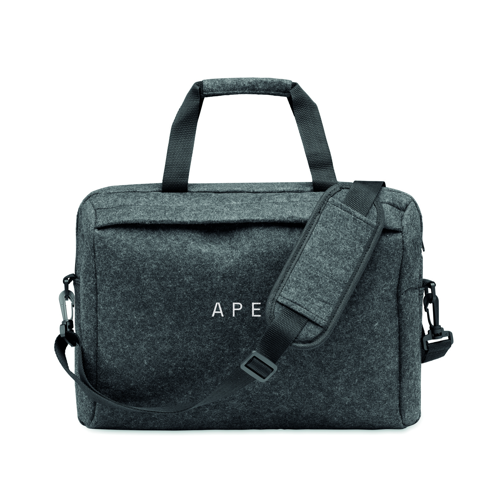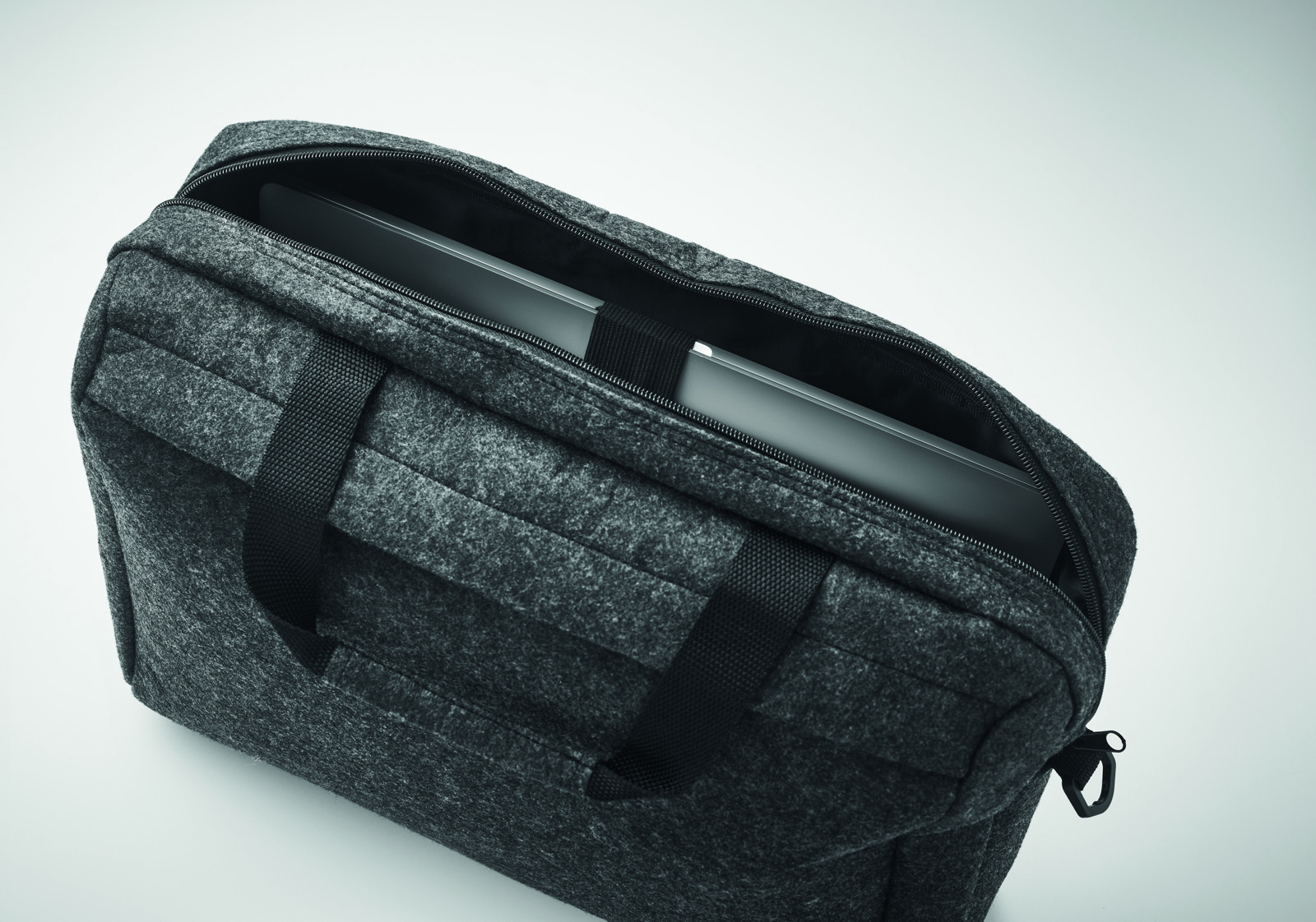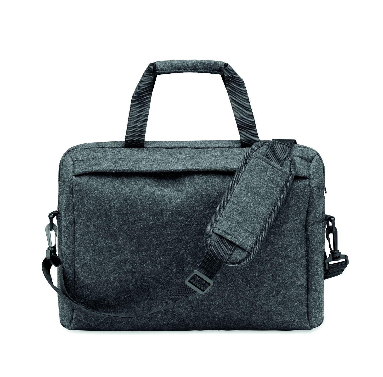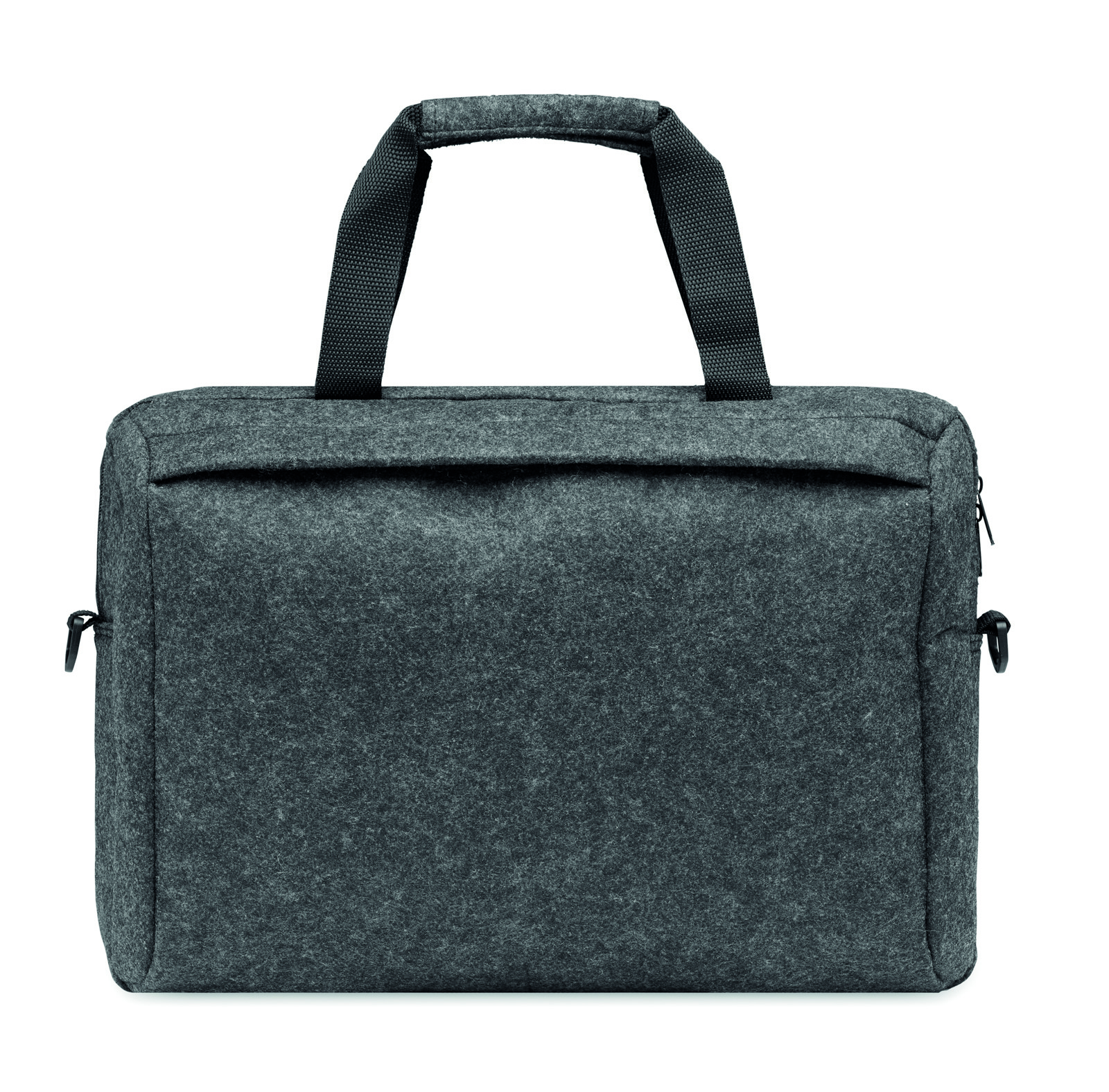 Porta laptop da 15''in feltro RPET con scomparto interno principale, tasca frontale con cerniera. Tracolla staccabile e regolabile. Supporto per trolley sul retro.