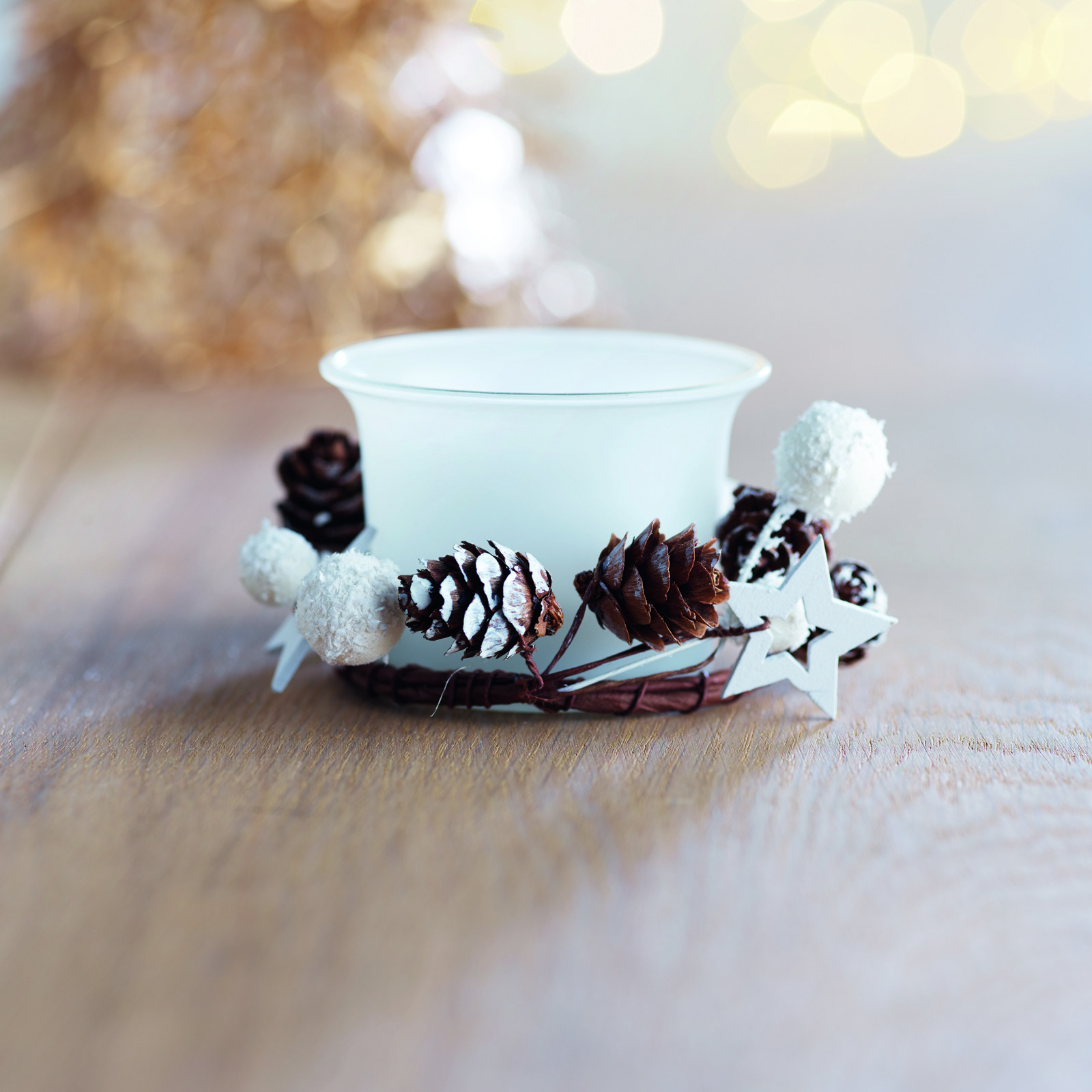 Portacandele in vetro con decorazioni natalizie. In scatola in PVC trasparente, fondo in cartone. Nastro e cartoncino.