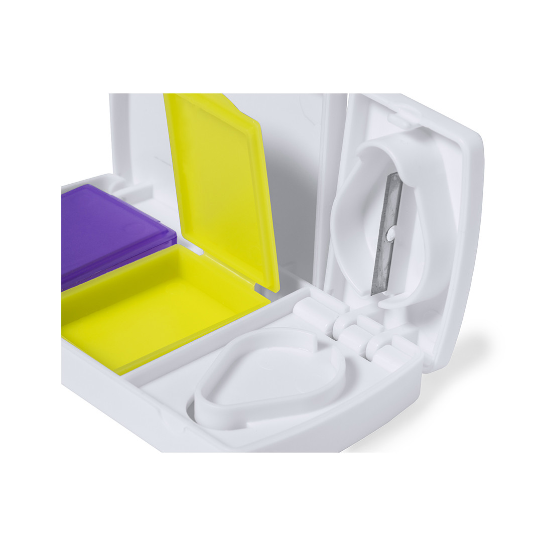Portapillole realizzato in materiale resistente e compatto, con finitura bianca. Con 2 sezioni interne, chiusura di sicurezza e lama per dividere le pillole. 2 Scomparti