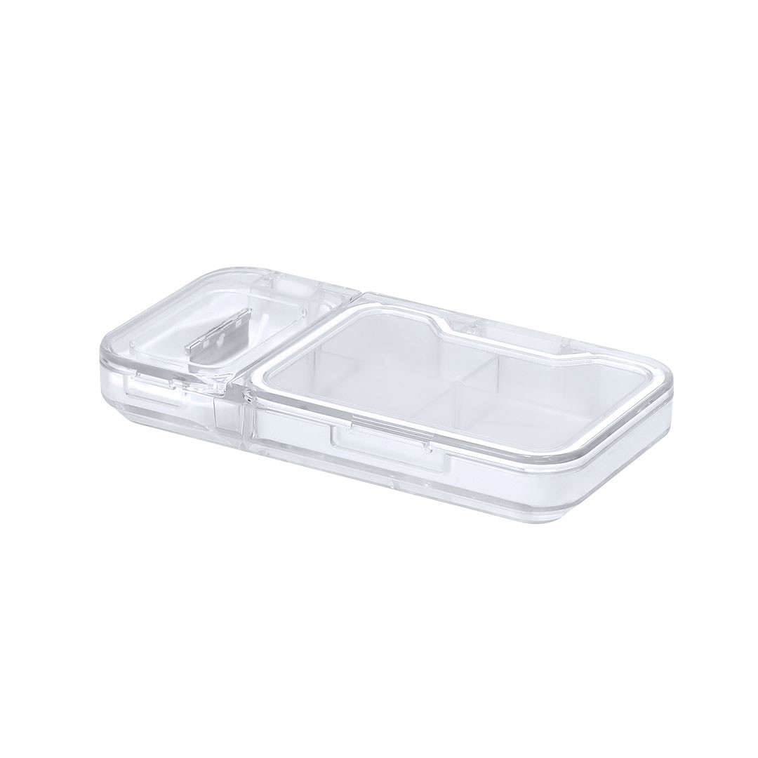Dispenser con 4 scomparti interni, chiusura di sicurezza con bordi in silicone e lama per dividere le pillole. Realizzato con finitura trasparente. 4 Scomparti