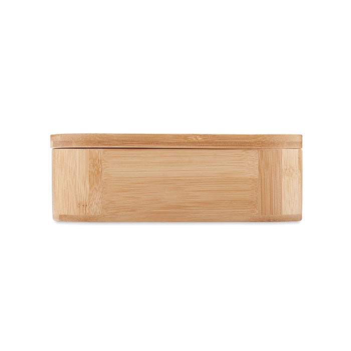 Portapranzo in acciaio inossidabile con coperchio in bamboo e 2 posate con fascia in poliestere removibile. Capacità 600 ml. Il bamboo è un prodotto naturale, potrebbero esserci lievi variazioni di colore e dimensioni da un articolo all'altro, che possono influire sul risultato finale della personalizzazione.