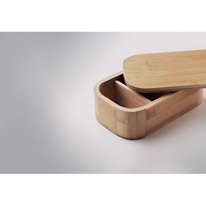 Portapranzo in bamboo con divisorio rimovibile e cinturino in nylon elastico. Solo per cibo secco. Capacità: 650 ml.