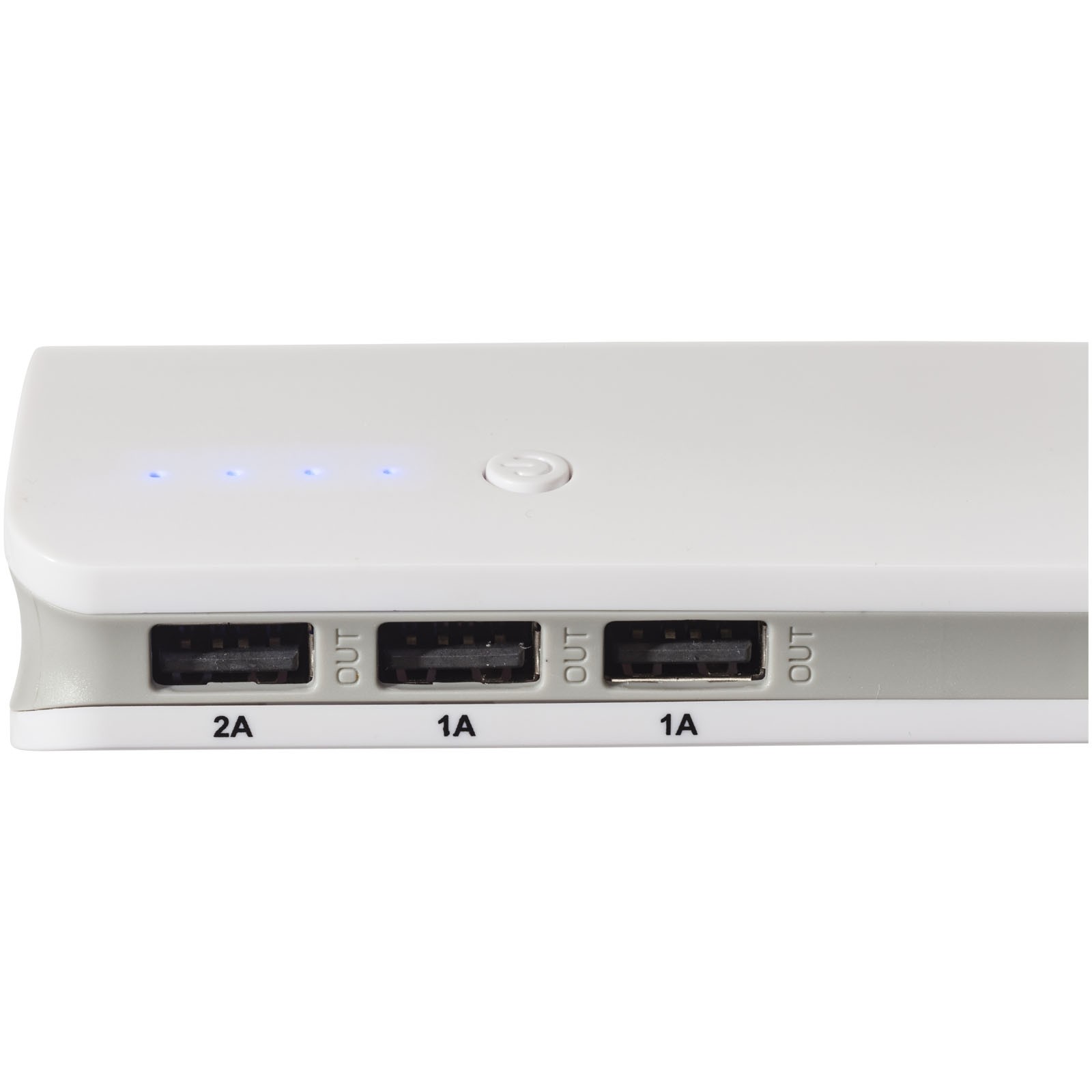 Il powerbank Spare contiene una batteria agli ioni di litio di Grado A da 10000 mAh e una torcia che può essere utile in luoghi a scarsa illuminazione o di notte. Permette di caricare fino a 3 dispositivi simultaneamente con una potenza massima di 5V/2.1A (uscita 1: 5V/1A, uscita 2: 5V/1A e uscita 3: 5V/2.1A). I 4 indicatori LED blu indicano il livello di carica della batteria. Include un cavo di ricarica USB con uscita Micro USB. Fornito in confezione regalo Avenue bianca.