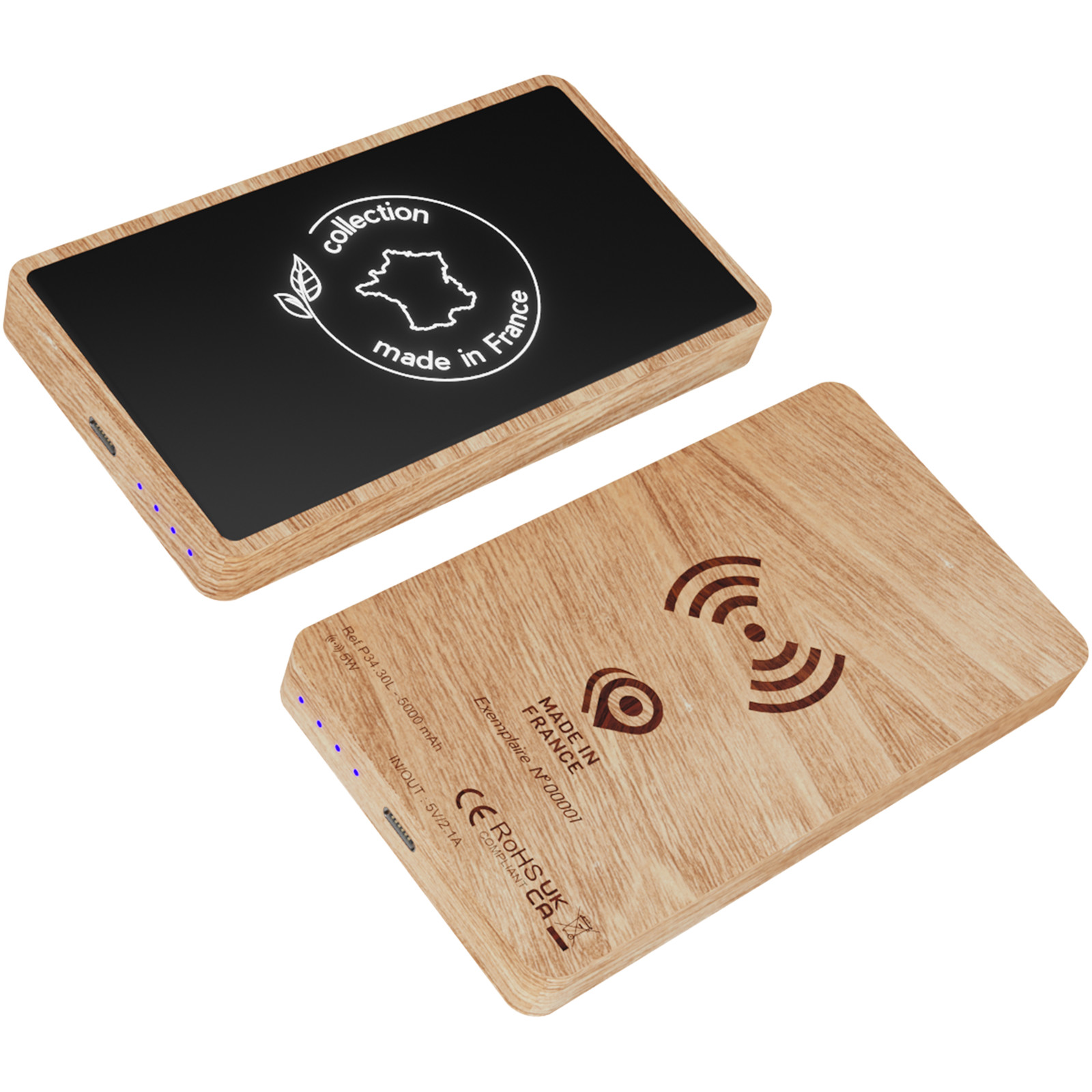 Power bank da 5000 mAh realizzato in legno di rovere francese con una finitura soft-touch. Il power bank dispone di un connettore input/output Type-C e può essere utilizzato anche come stazione di ricarica wireless per dispositivi compatibili con Qi. Il logo si illumina per 30 secondi quando il power bank viene maneggiato e rimane acceso durante la ricarica. Fornito con un cavo di ricarica 3 in 1 in rPET e una confezione regalo in carta riciclata (16,5 x 8 x 2,7 cm) con chiusura magnetica. Garanzia di 3 anni inclusa.
