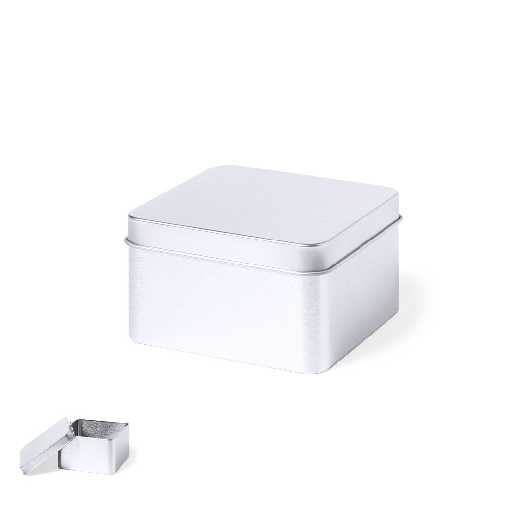 Scatola di presentazione quadrata, in robusto metallo argentato, con coperchio coordinato.