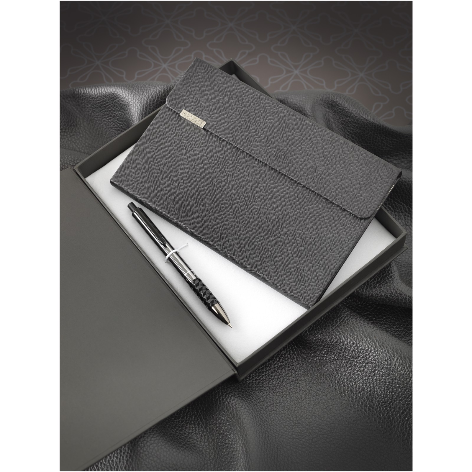 Taccuino dal design esclusivo (in formato A5) con copertina in TPU, nastro segna pagina di colore nero, chiusura magnetica e 80 fogli (80 g/m²) a righe di color crema. Accoppiato con la penna a sfera tattica a scatto. Entrambi gli articoli sono confezionati in una confezione regalo LUXE. Dimensioni del taccuino: 13,5 x 20,5 cm. Lunghezza della penna: 14 cm. Diametro della penna: 1,05 cm.