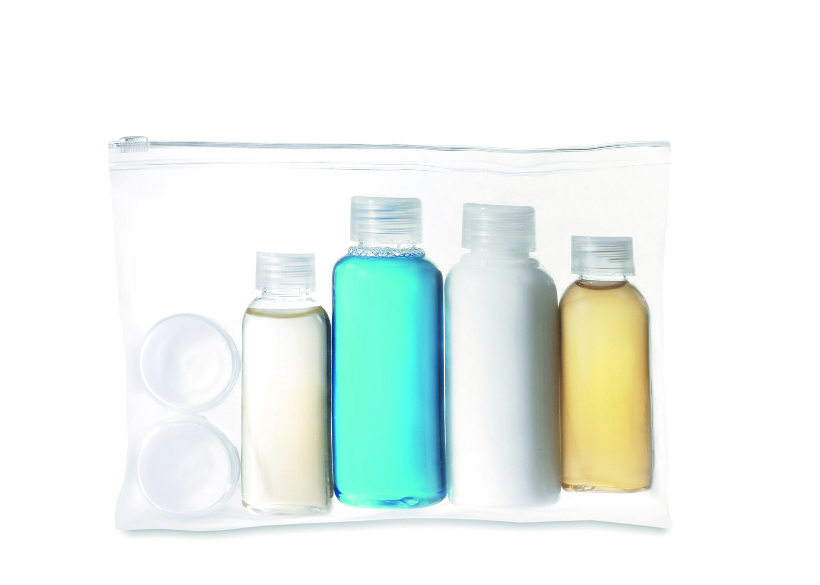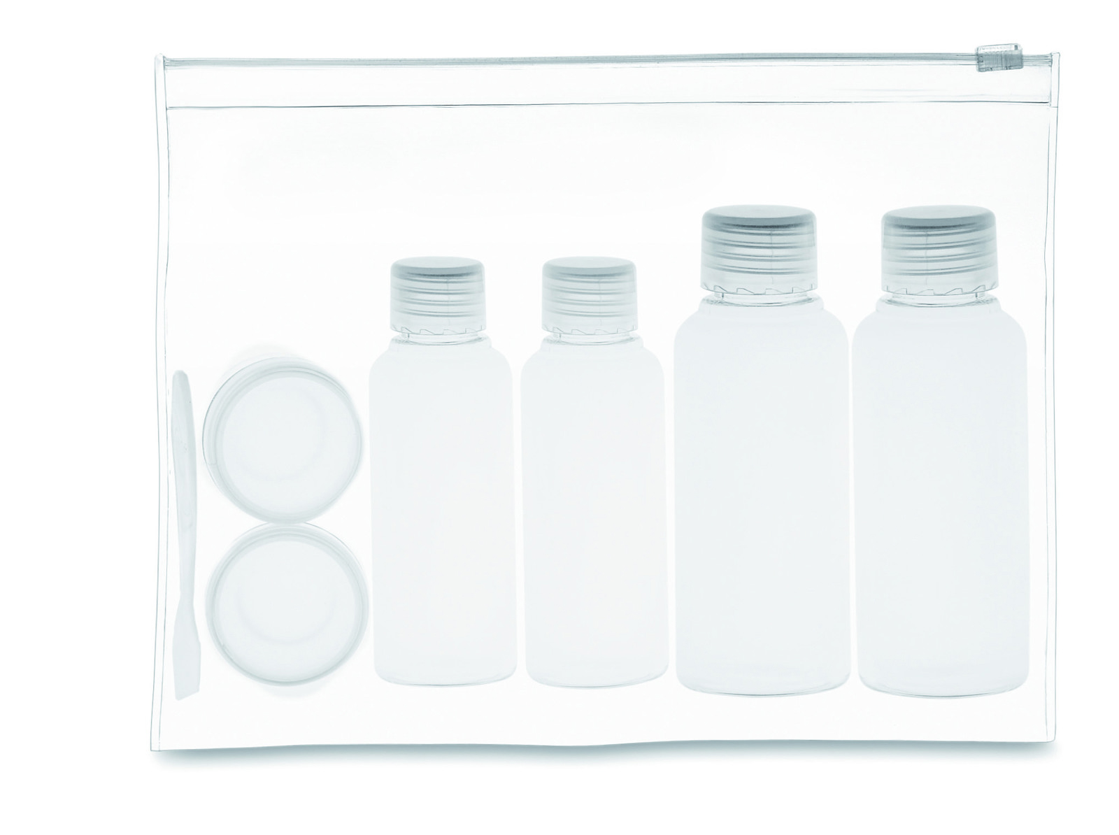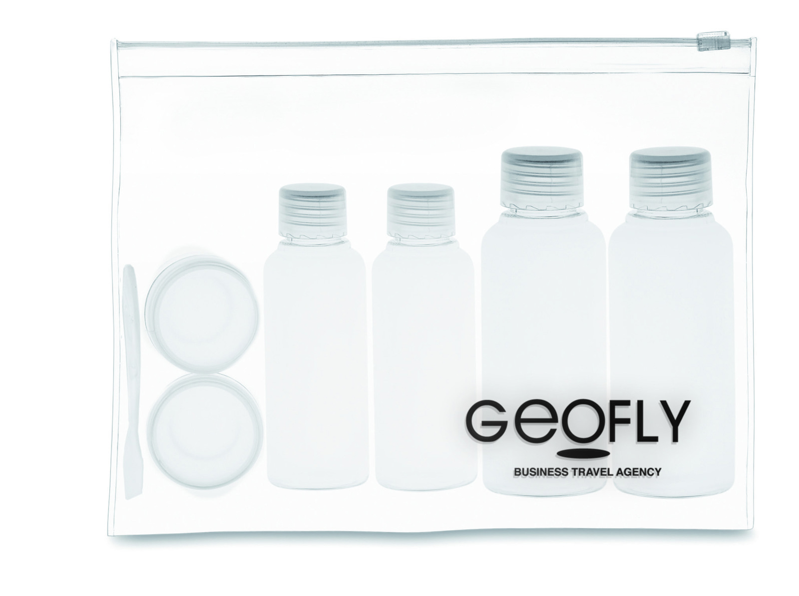 Set viaggio 4 flaconi e 2 porta lenti a contatto in plastica in busta trasparente richiudibile. (100ml, 50ml and 10ml).