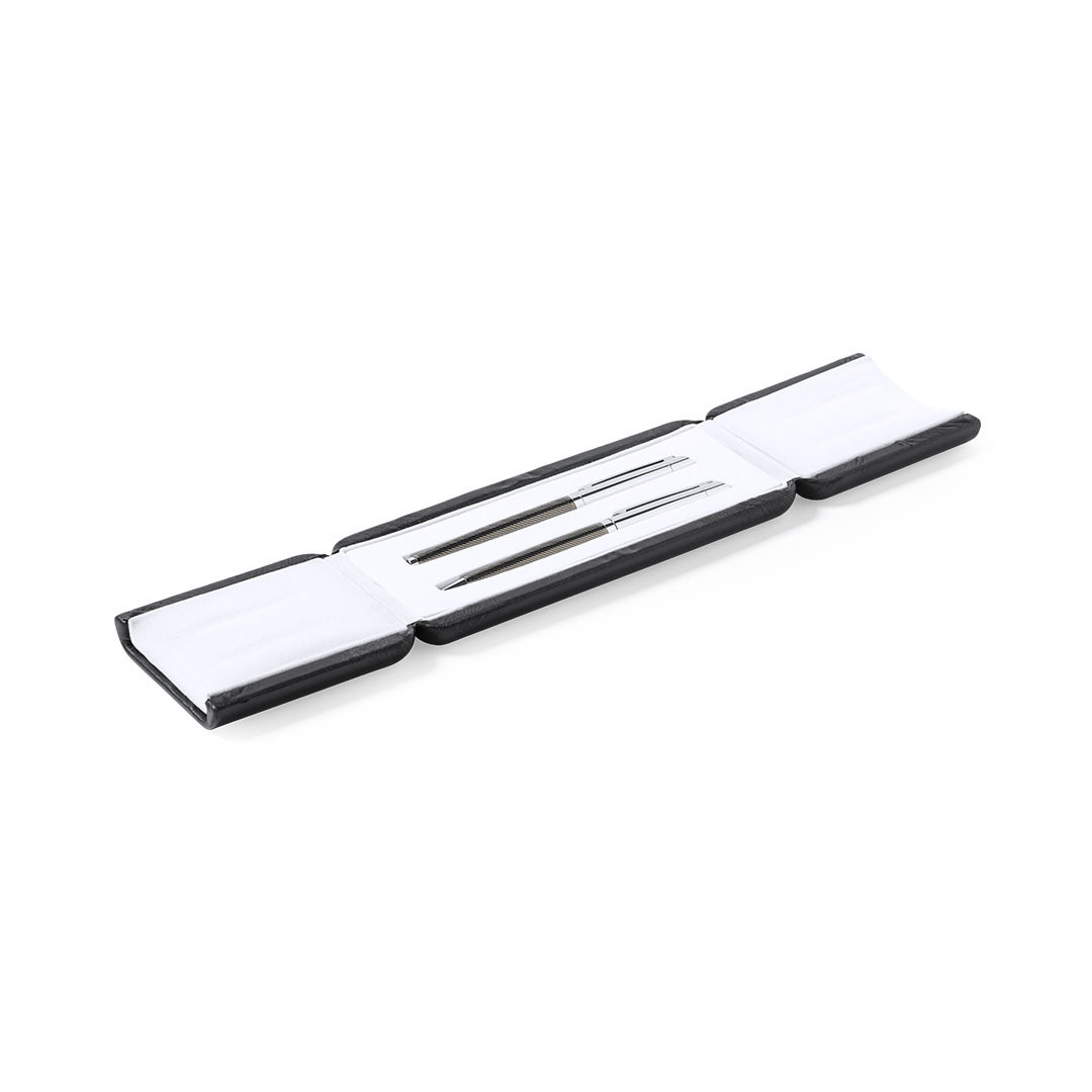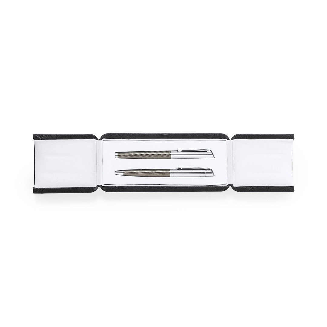 Set di penne a sfera e roller di alta qualità. Realizzato in un'elegante combinazione di metallo nei toni del nero e del cromo. Penna a sfera con meccanismo a rotazione e refill blu, con cartuccia jumbo. Penna roller con cappuccio e refill gel in blu, con cartuccia jumbo. Confezionato in una custodia individuale in similpelle con interno in camoscio bianco a contrasto. Penna e Roller. Refill Jumbo