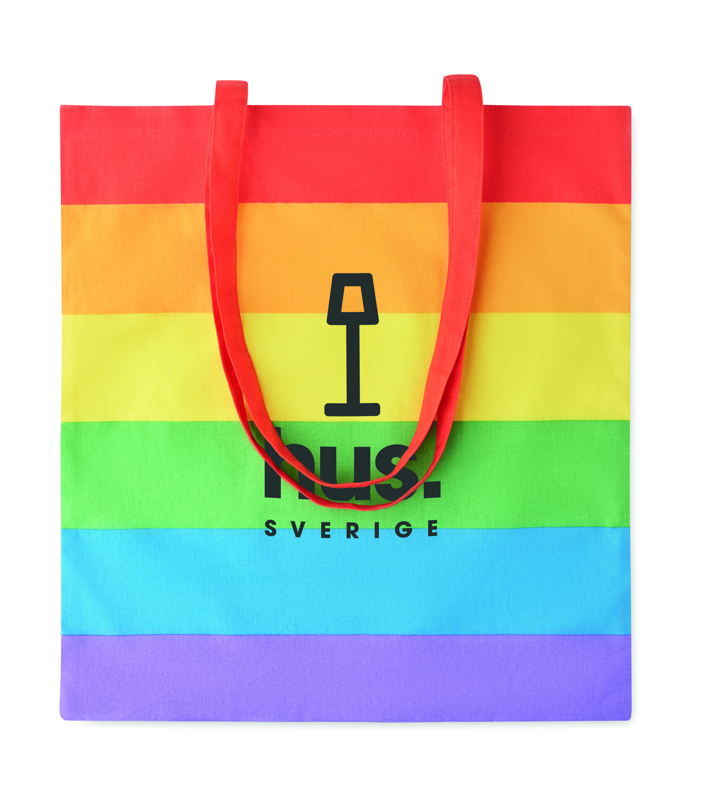 Shopping bag in cotone arcobaleno da 200 gr/m² con manici lunghi. Aggiungete un po' di colore al marchio o a un messaggio speciale con questa allegra tote bag. Questa borsa è ideale per la spesa quotidiana. potete portarla per i manici lunghi o appenderla sulla spalla per avere le mani libere. Peso limite di trasporto 2.5kgs. Questo prodotto è certificato OEKO-TEX® STANDARD 100.