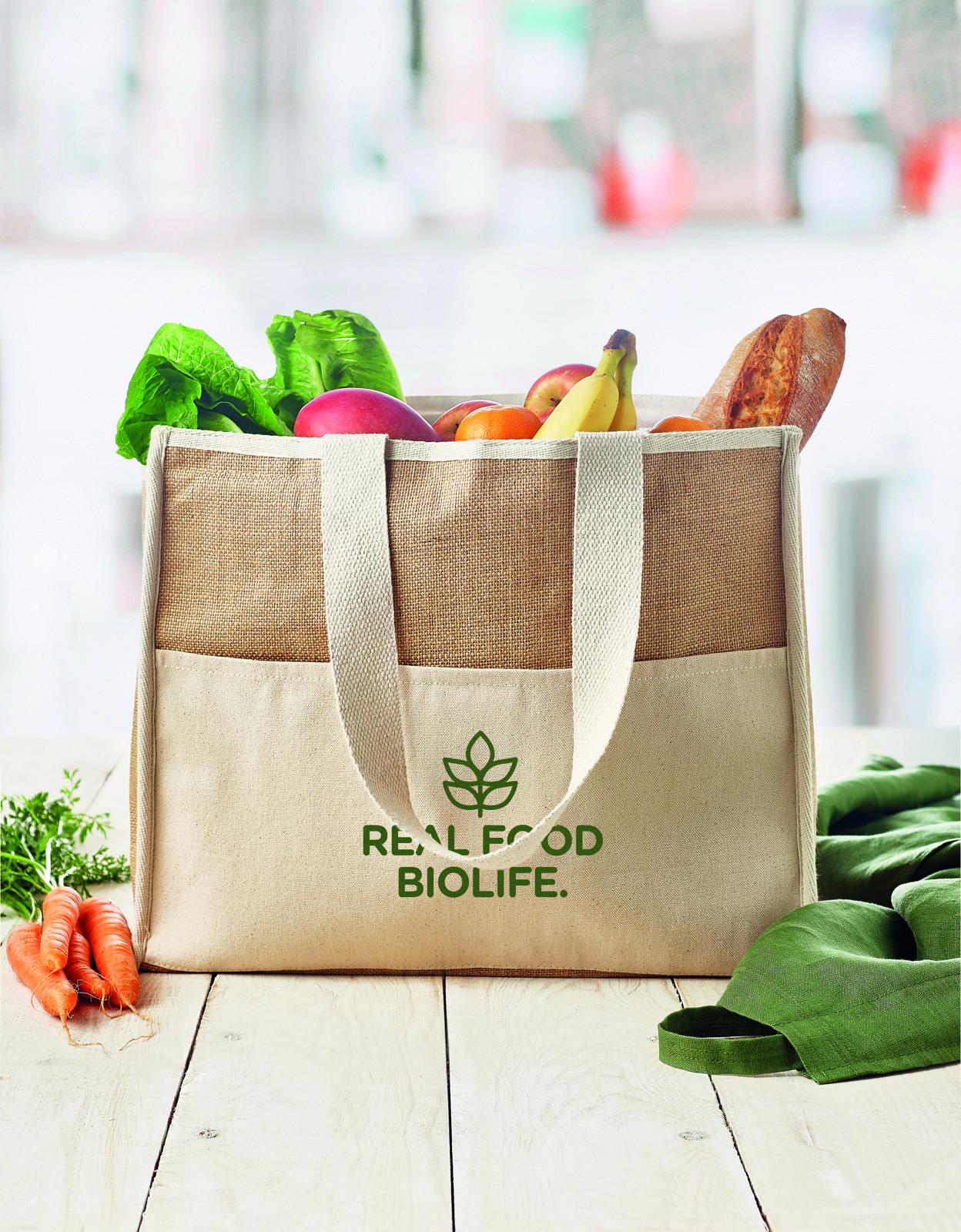 Questa shopper in iuta con manici lunghi ha un interno laminato per mantenere cibi e bevande freschi e una chiusura a strappo. La parte anteriore ha una tasca in tela con fettuccia di cotone per gli oggetti più piccoli. E' perfetta per la spesa quotidiana e ha una lunga durata, il che la rende un'ottima alternativa ai sacchetti di plastica usa e getta. Questo prodotto è certificato OEKO-TEX® STANDARD 100.