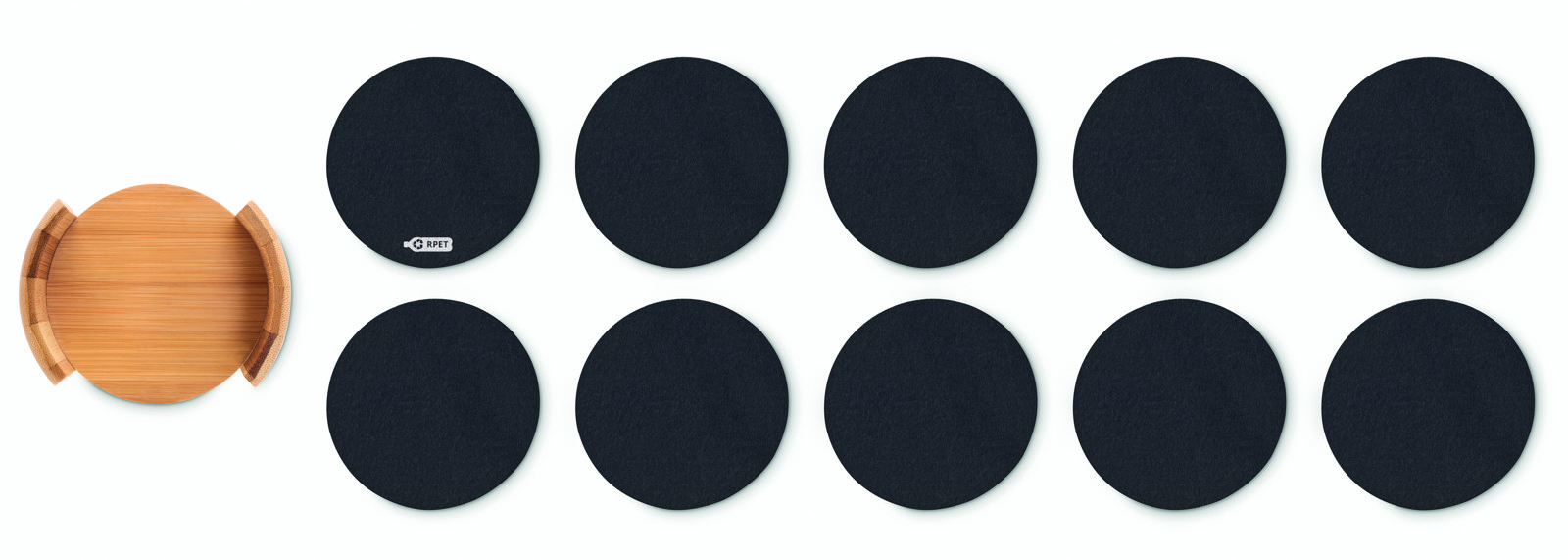 Set di 10 sottobicchieri in feltro RPET presentati in un supporto di bamboo.